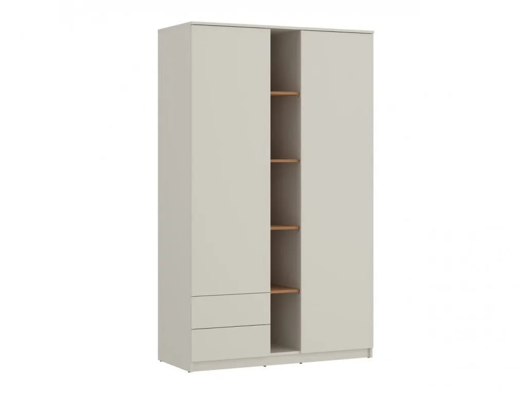 Wykonana z laminowanej płyty wiórowej, szafa Fano jest utrzymana w odcieniu Kaszmir, który dodaje jej elegancji. Unikalnym akcentem są otwarte półki w kolorze Dąb Karmel, które nie tylko dodają charakteru, ale również umożliwiają eksponowanie dekoracji. Bezuchwytowy system otwierania drzwi podkreśla minimalistyczny wygląd mebla.