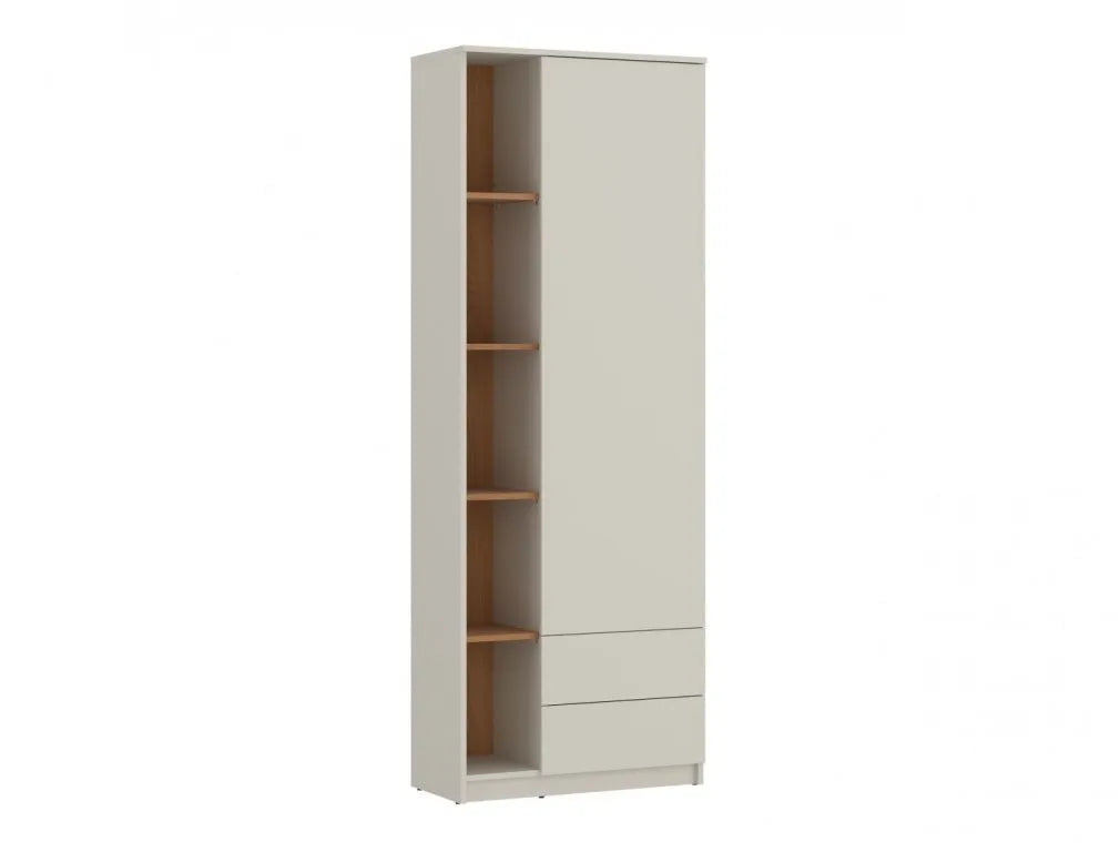 Jednodrzwiowa szafa Fano to funkcjonalny i stylowy element aranżacji pokoju młodzieżowego, który doskonale łączy asymetrię i prostotę designu. Wykonana z laminowanej płyty wiórowej, szafa zachwyca zestawieniem jasnego odcienia Kaszmiru z naturalnym, karmelowym wybarwieniem dębu (Dąb Karmel), co nadaje jej nowoczesnego i jednocześnie przytulnego charakteru.