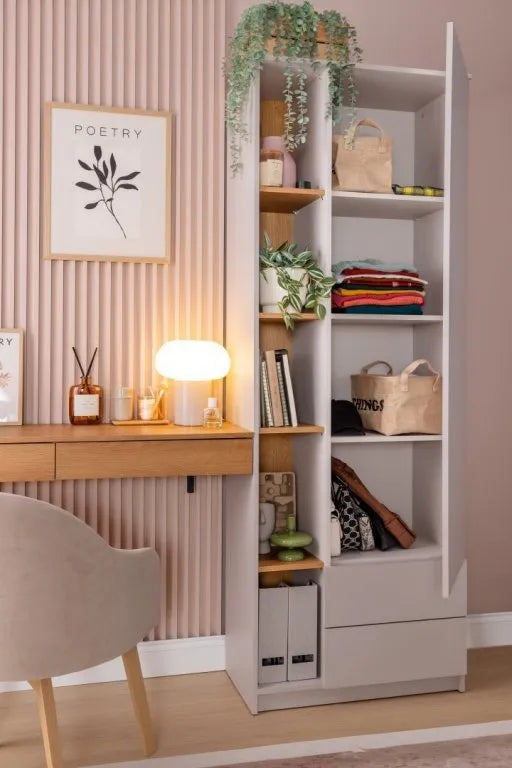 Jasna kolorystyka szafy i jej przemyślany design czynią ją odpowiednią do niewielkich przestrzeni, gdzie każdy centymetr ma znaczenie. Szafa Fano nie tylko ułatwia utrzymanie porządku, ale także dodaje wnętrzu elegancji i nowoczesnego charakteru, idealnie dopasowując się do strefy relaksu, snu i nauki w pokoju młodzieżowym.