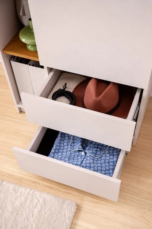 Szafa Fano wyposażona jest w wygodne prowadnice kulkowe szuflad, które umożliwiają pełen wysuw i łatwy dostęp do przechowywanych rzeczy. Dodatkowo, puszkowe zawiasy gwarantują niezawodność otwierania i zamykania frontu drzwiowego, co podkreśla wysoką jakość wykonania mebla. Minimalistyczna stylistyka systemu bezuchwytowego sprawia, że szafa idealnie wpisuje się w nowoczesne aranżacje, a także dobrze komponuje się z wystrojami w stylu vintage czy loftowym.