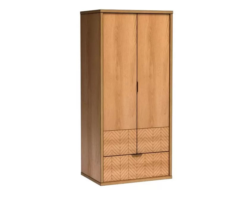 Szafa dwudrzwiowa z kolekcji FONTI jest prosta, funkcjonalna i posiada front z dekorem w jodełkę, co nadaje jej wyjątkowy wygląd. Kolor dąb karmel dodaje jej ciepła i naturalności.