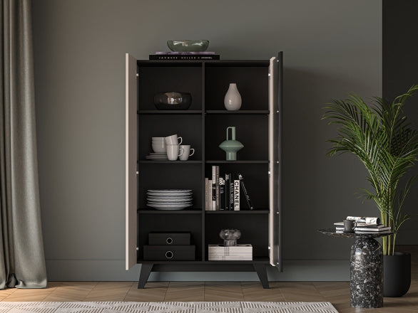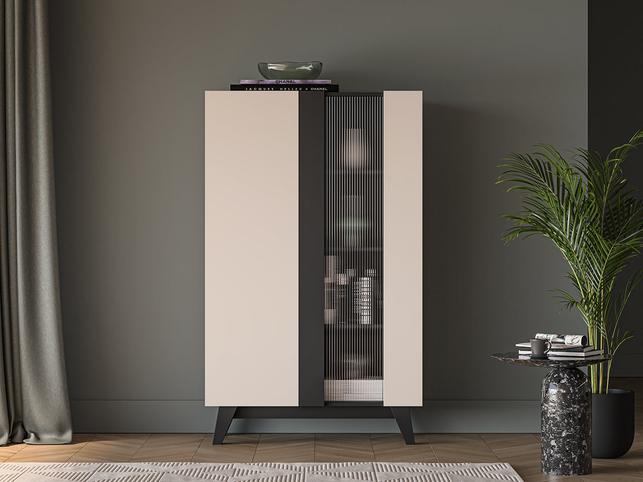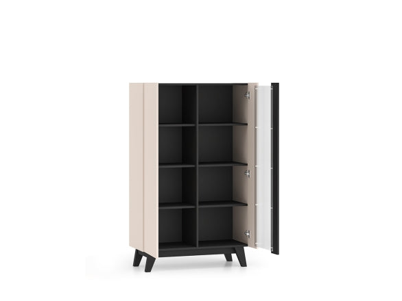 Zestawienie pełnego oraz przeszklonego frontu pozwala na dowolną organizację wnętrza. Za szkłem można wyeksponować elegancką zastawę, dekoracje lub kolekcje, natomiast za pełnymi drzwiami ukryć mniej reprezentacyjne przedmioty. Praktyczny układ półek ułatwia utrzymanie porządku i wygodne rozmieszczenie zawartości.