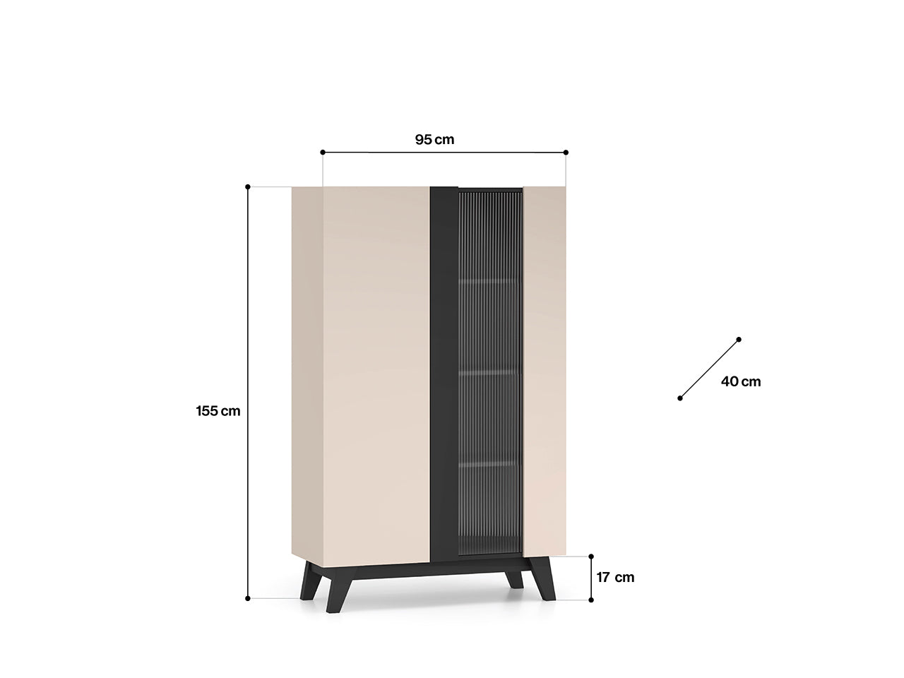 Witryna Freshion to funkcjonalny mebel, który łączy estetyczną formę z codzienną wygodą użytkowania. Przy wysokości 155 cm umożliwia swobodny dostęp do wszystkich półek, a wymiary 95 cm szerokości i 40 cm głębokości sprawiają, że oferuje sporo miejsca do przechowywania, nie dominując przestrzeni w pomieszczeniu.