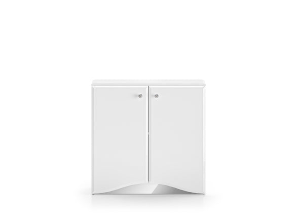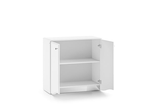 Za dwoma uchylnymi drzwiami znajduje się pojemna przestrzeń z półką, która ułatwia wygodne podzielenie wnętrza na strefy. Dzięki temu z łatwością uporządkujesz dokumenty, tekstylia, akcesoria czy drobiazgi codziennego użytku. Pełne fronty subtelnie ukrywają zawartość, pomagając utrzymać wizualny ład w pomieszczeniu.