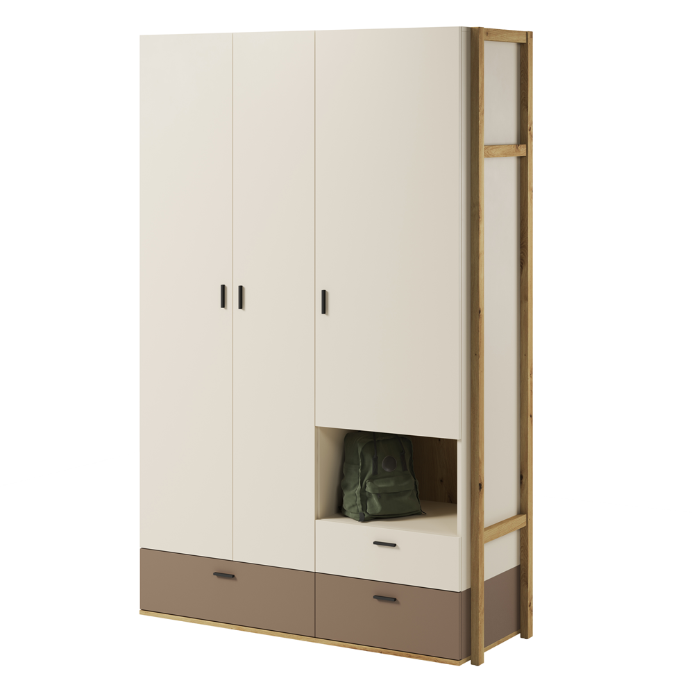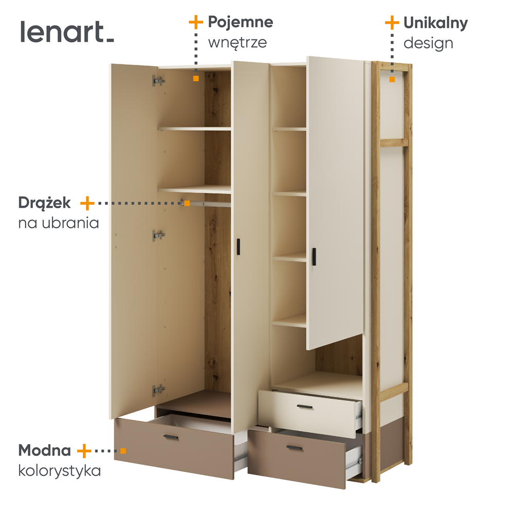 Szafa Lenny to trzydrzwiowy mebel, który charakteryzuje się funkcjonalnym designem. Posiada ona niewielką wnękę przeznaczoną na drobne ozdoby, co dodaje jej dodatkowego uroku. Na dolnej części szafy umieszczono trzy praktyczne szuflady, które pozwalają na porządkowanie drobnych przedmiotów.