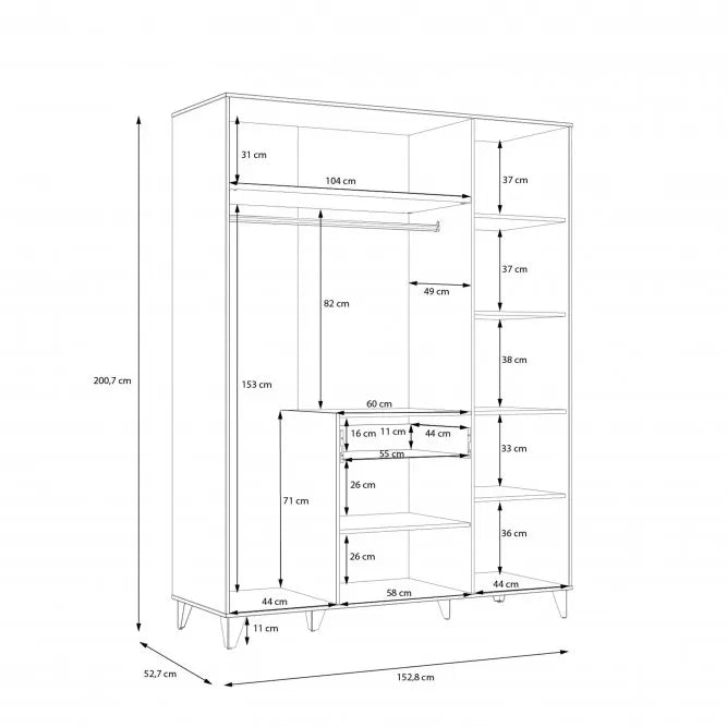 Wnętrze szafy zostało zaprojektowane tak, aby maksymalnie wykorzystać dostępną przestrzeń. Mnóstwo półek umożliwia przechowywanie różnych przedmiotów, takich jak ubrania, buty, akcesoria czy bielizna. Dodatkowo, drążek pozwala na zawieszenie odzieży na wieszakach, co ułatwia organizację garderoby.