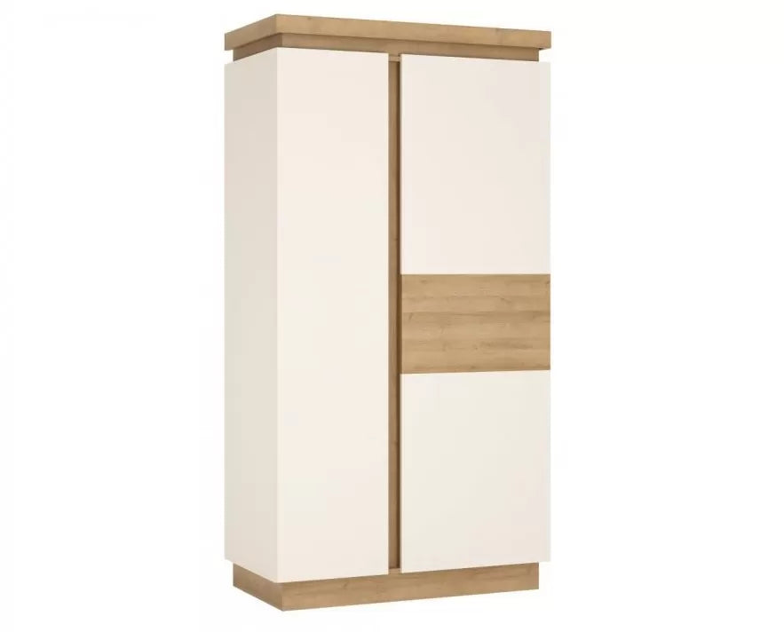 Szafa dwudrzwiowa Lyon w jasnym odcieniu jest eleganckim i praktycznym meblem do przechowywania. Jej kolorystyka to dąb riviera jasny detali, a fronty i boki mają biały połysk, co dodaje jej nowoczesnego wyglądu.