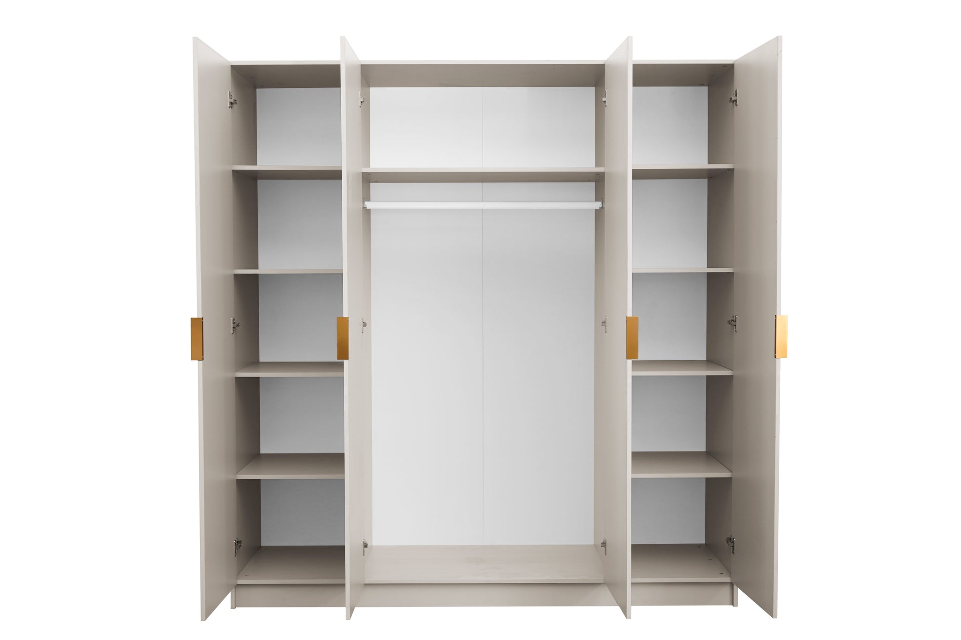Szafa Marbella jest wyposażona w złote uchwyty metalowe, które dodają jej luksusowego wyglądu. Wewnątrz znajduje się drążek na ubrania oraz 12 półek zamykanych, co umożliwia wygodne i uporządkowane przechowywanie odzieży i akcesoriów. Dodatkowo, nad drążkiem znajduje się dodatkowe duże miejsce do przechowywania, idealne na sezonowe przedmioty czy większe akcesoria.