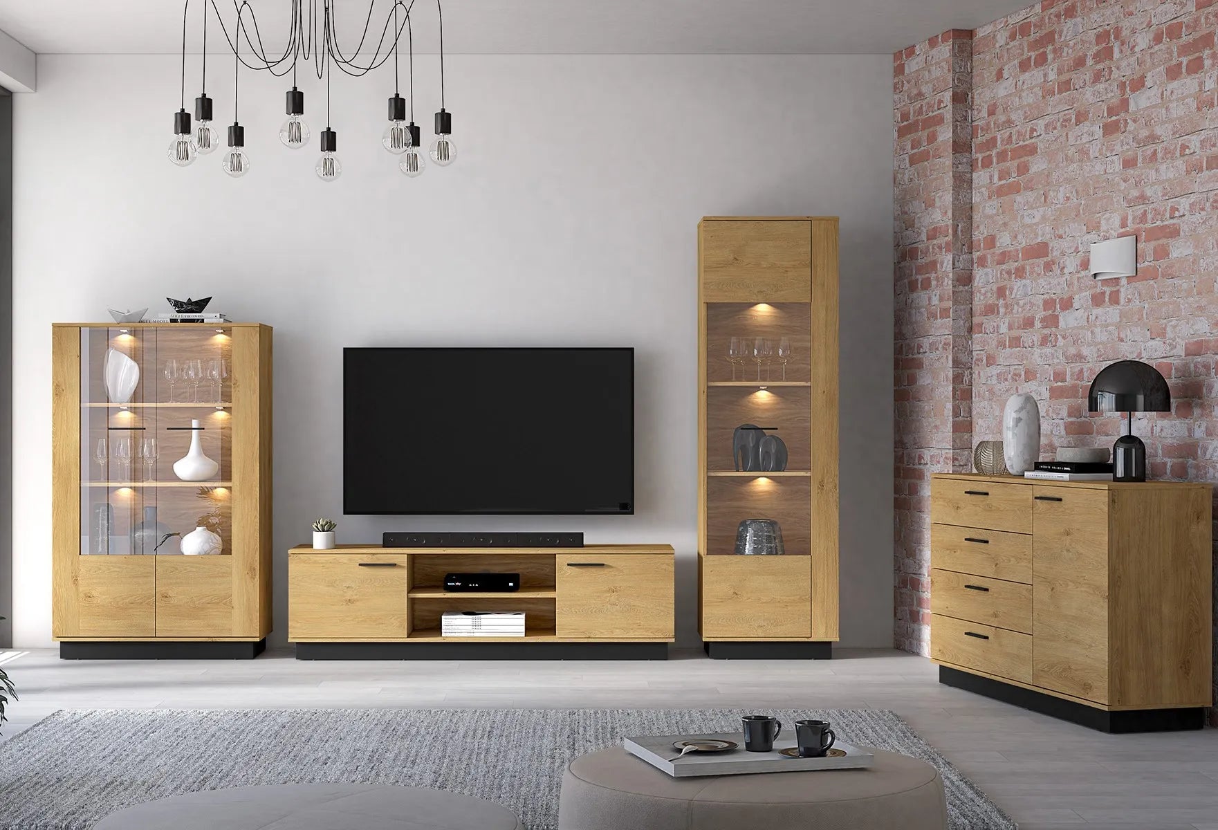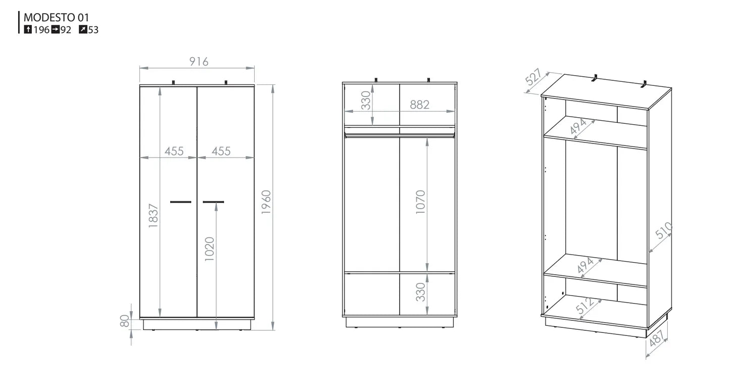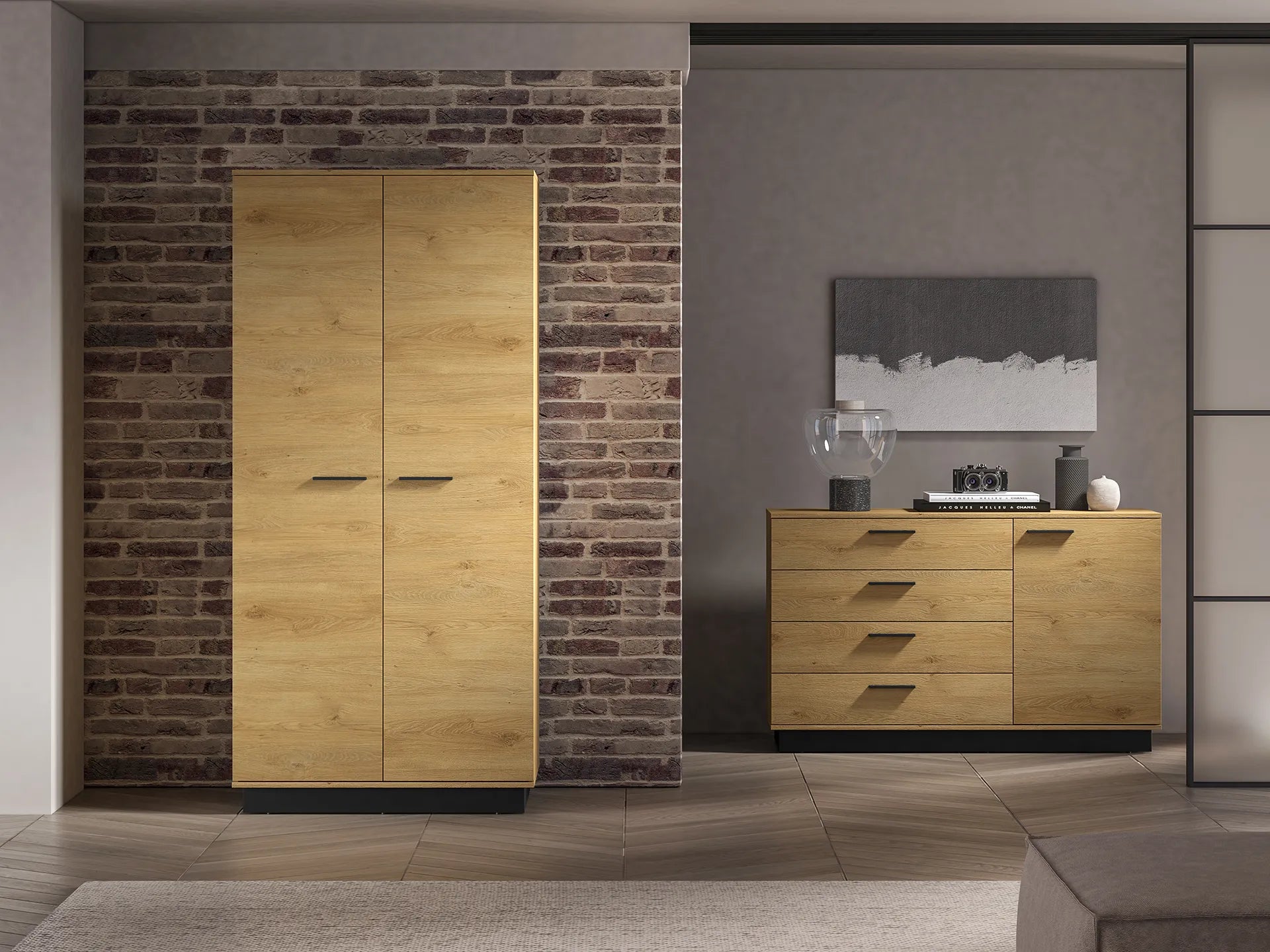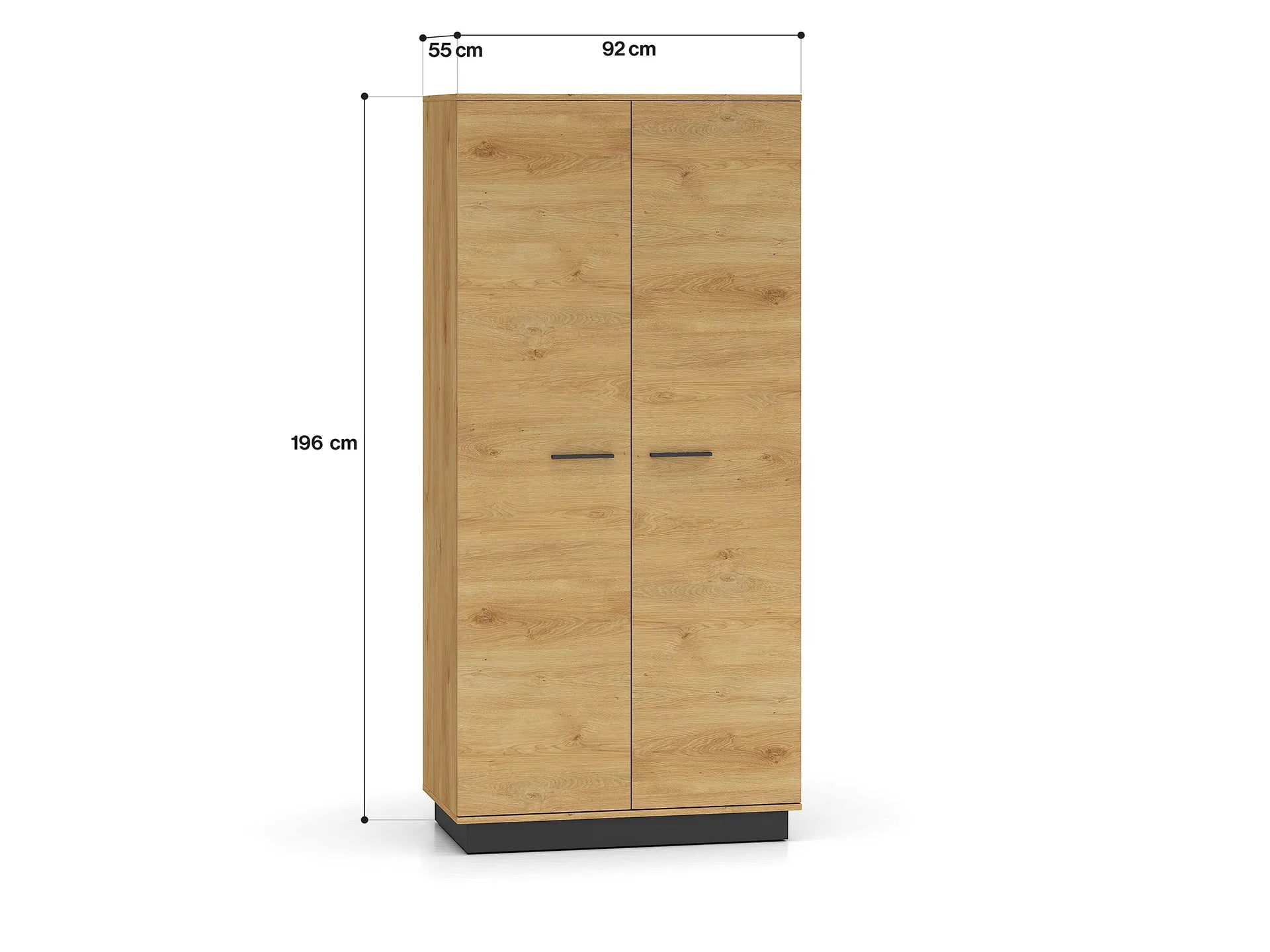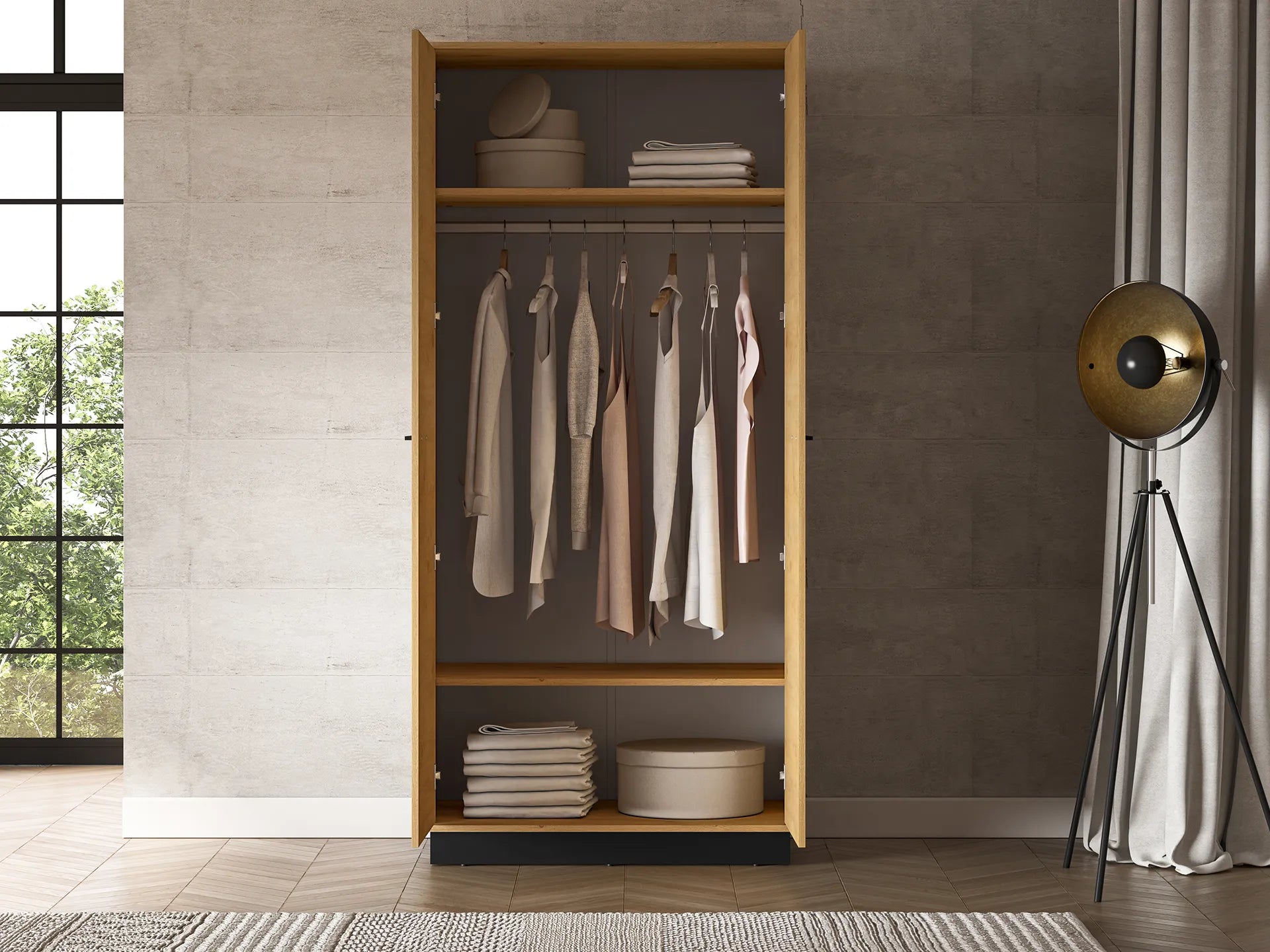 Szafa Modesto to elegancka, dwudrzwiowa szafa uchylna, idealna do nowoczesnych wnętrz. Wykonana w stylowym kolorze dąb, doskonale łączy funkcjonalność z estetyką. Wewnątrz szafy znajdują się dwie praktyczne półki – górna i dolna – które umożliwiają wygodne przechowywanie odzieży, akcesoriów czy innych przedmiotów. Dodatkowo, szafa jest wyposażona w drążek na wieszaki, co pozwala na komfortowe przechowywanie ubrań. Całość dopełnia nowoczesny czarny cokół, który dodaje szafie elegancji i sprawia, że pasuje ona do różnorodnych aranżacji wnętrz. Idealna do sypialni, przedpokoju lub garderoby.