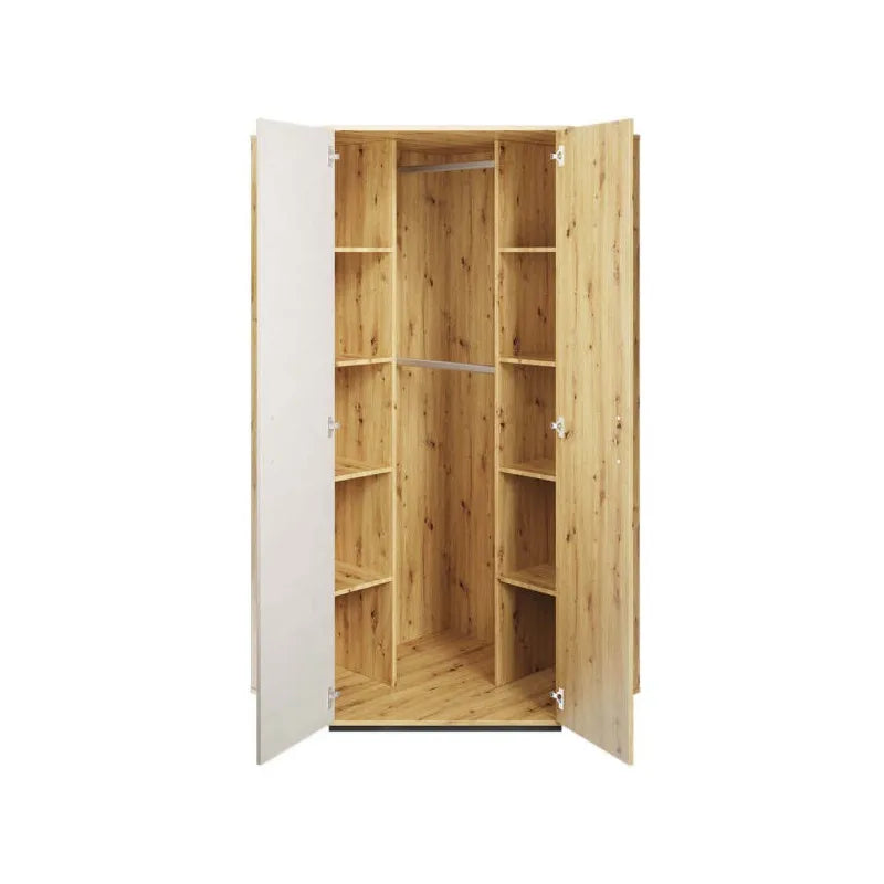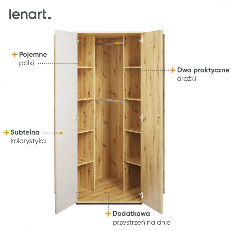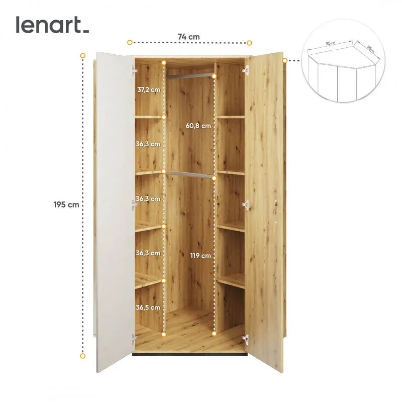 Szukasz szafy, który pomieści całą garderobę Twojego dziecka? Idealnym rozwiązaniem będzie szafa narożna Qubic, produkcji Lenart Meble! Jej kształt pozwoli w pełni wykorzystać narożną przestrzeń, której zawsze tak bardzo brakuje w pokoju dziecka. W szafie znajdują się dwa drążki, które idealnie sprawdzą się w przypadku wiszących ubrań, zaś wewnętrzne półki pozwolą na wygodne przechowywanie obuwia, bielizny czy tez akcesoriów sportowych. Wybarwienie w odcieniu drewna oraz subtelnej szarości sprawi, że wnętrze będzie wyglądało delikatnie, a zarazem oryginalnie. Metalowe uchwyty dodają całości nowoczesnego, uniwersalnego designu, który wpasuje się w gust zarówno dziewczynek, jak i chłopców. Szafę Qubic wykonano z odpornej na zniszczenia płyty laminowanej