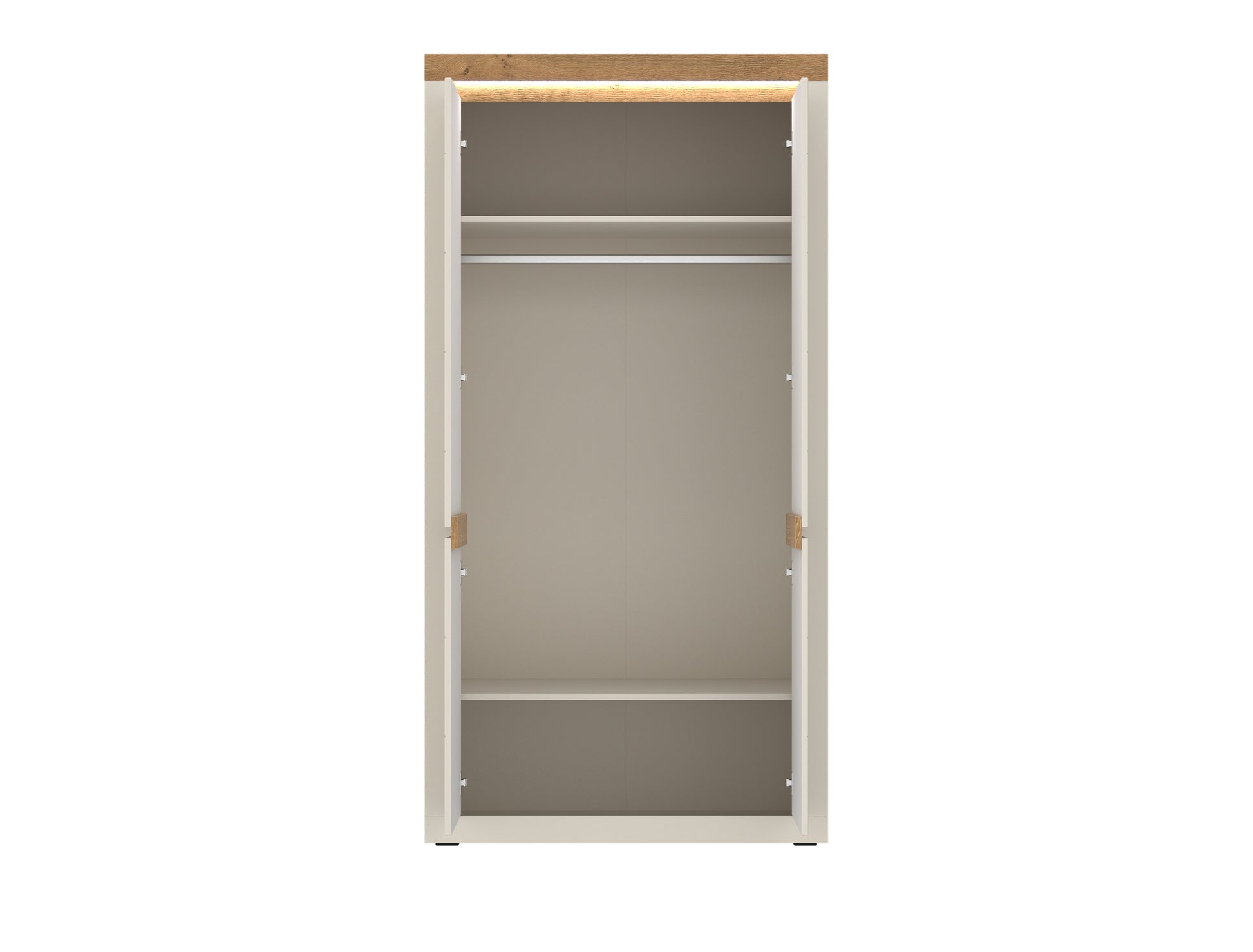 Przemyślane wnętrze szafy umożliwia komfortową organizację ubrań – zarówno tych składanych, jak i wymagających wieszania. Dzięki temu mebel sprawdzi się jako praktyczna garderoba, pomagając utrzymać porządek i dobrą organizację przestrzeni.