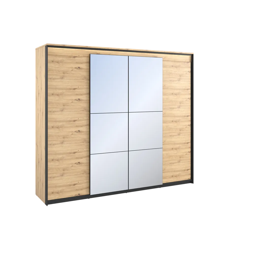 Dwoje drzwi tej funkcjonalnej szafy są lustrzane, co dodaje przestrzeni i optycznie powiększa pomieszczenie. To idealne rozwiązanie dla tych, którzy cenią sobie nie tylko praktyczność, ale także estetykę.