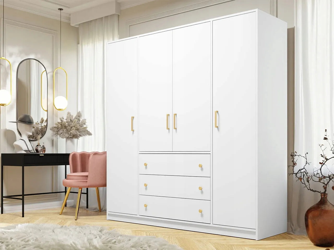 Biały kolor szafy nadaje jej ponadczasowego wyglądu, który doskonale komponuje się z różnymi aranżacjami wnętrz. Złote uchwyty stanowią subtelny, lecz efektowny akcent, dodając szafie finezji i luksusowego wykończenia. To detale decydujące o unikalności mebla, które z pewnością przyciągną wzrok i sprawią, że szafa stanie się centralnym punktem przestrzeni.