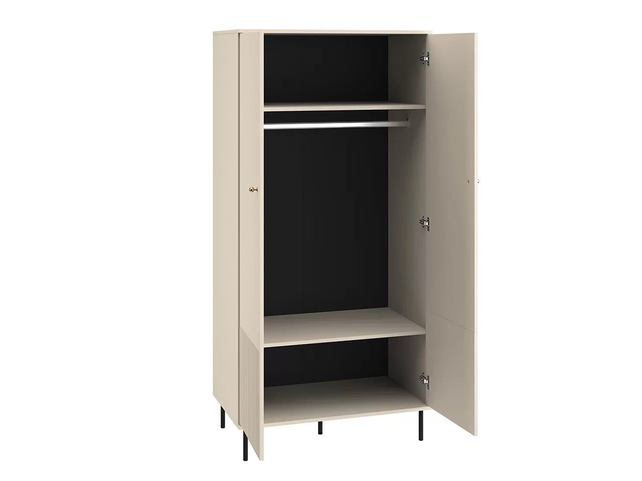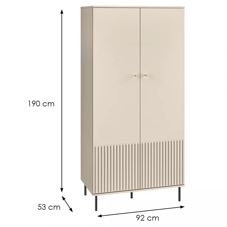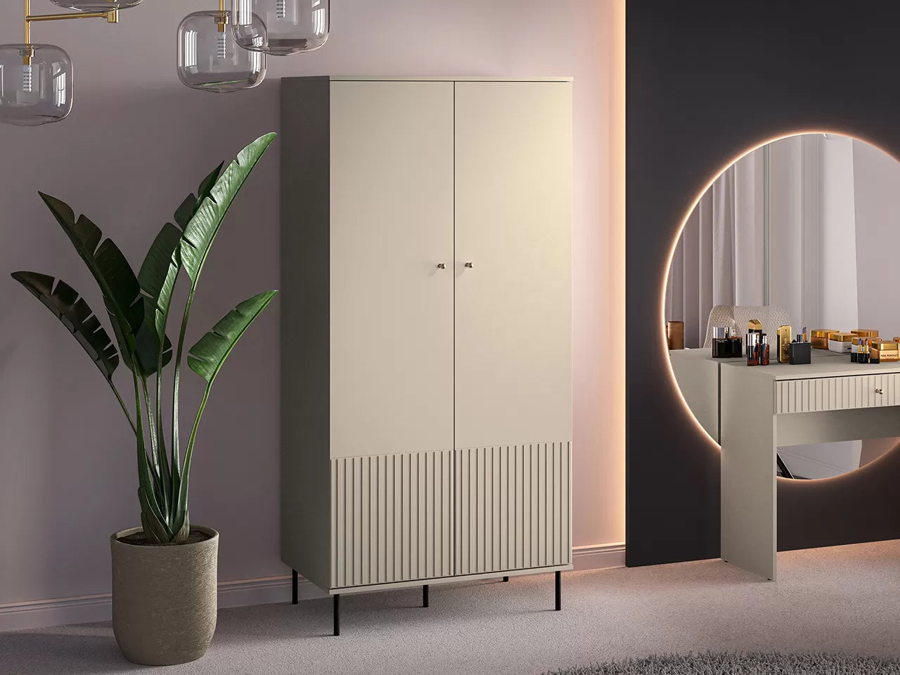 Szafa Sophie to nowoczesny dwudrzwiowy mebel. Jej konstrukcja jest solidna, wykonana z MDF frezowanego, co nadaje jej wyjątkowego wyglądu. Kolor mebla to delikatny odcień cashmere, który dodaje wnętrzu subtelności i klasy.