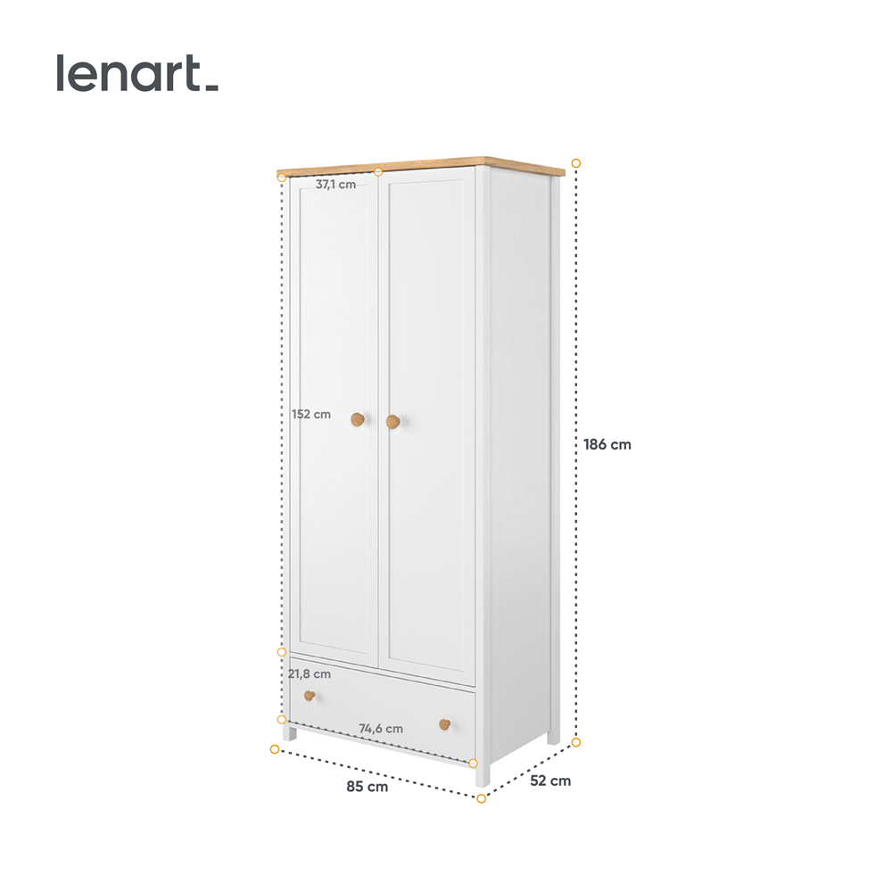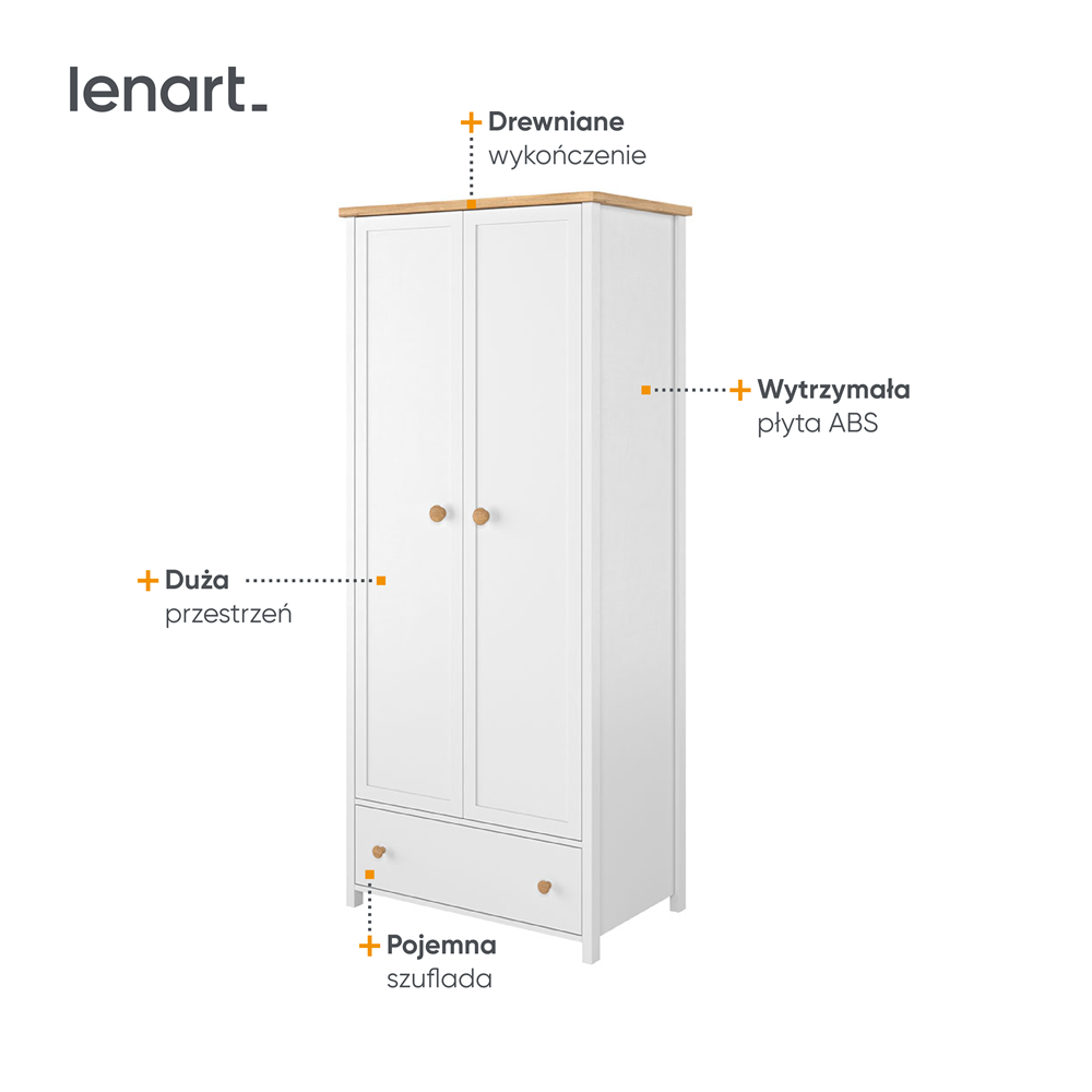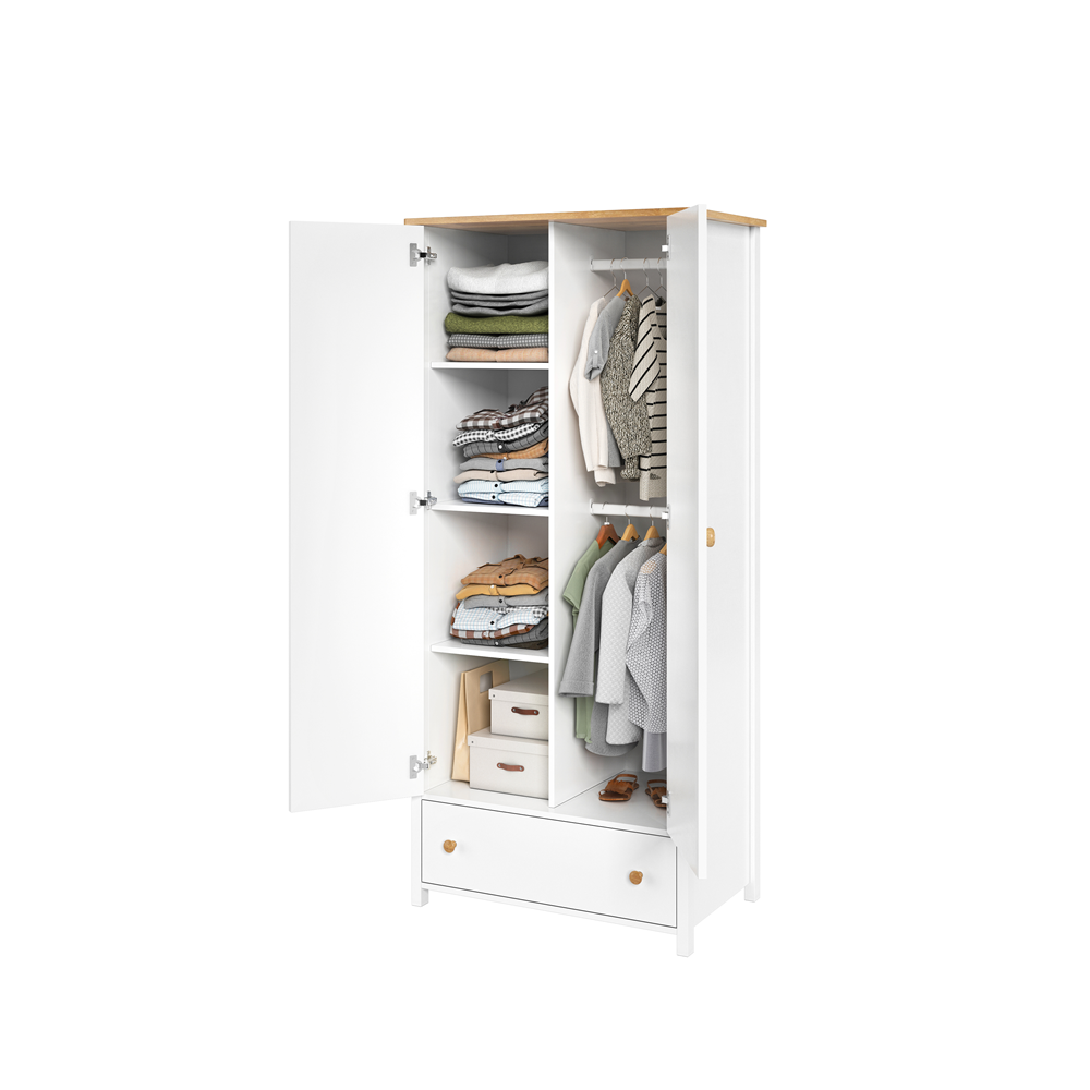 Szafa posiada również praktyczną szufladę na drobiazgi, co ułatwia organizację różnorodnych przedmiotów. Wewnętrzny drążek stanowi wygodne miejsce do zawieszenia ubrań, co sprawia, że szafa jest jeszcze bardziej funkcjonalna.