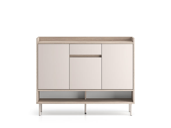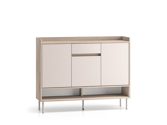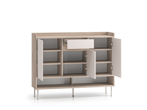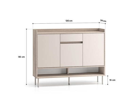 Głębokość 34 cm sprawia, że szafka dobrze odnajduje się również w węższych korytarzach, nie zaburzając swobody przejścia. Wysokość 95 cm pozwala wykorzystać blat jako podręczną strefę odkładczą na torebkę, plecak czy dokumenty. Podwyższone obrzeże z tyłu i po bokach zapobiega zsuwaniu się drobiazgów. Smukłe nóżki nadają bryle lekkości i ułatwiają utrzymanie czystości pod meblem, a zestawienie stonowanego Cashmere z naturalnym rysunkiem Dąb Cremona Terracotta podkreśla nowoczesny charakter mebla.