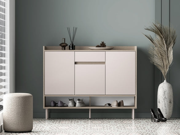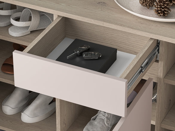Korpus w dekorze Dąb Cremona Terracotta oraz fronty w kolorze Cashmere wykonano z płyty meblowej, co zapewnia trwałość i odporność na codzienne użytkowanie. Waga 45 kg przekłada się na stabilność konstrukcji. Wyraźny podział – obuwie za drzwiami, akcesoria w szufladzie i szybki dostęp na półce otwartej – zwiększa funkcjonalność i wygodę korzystania.