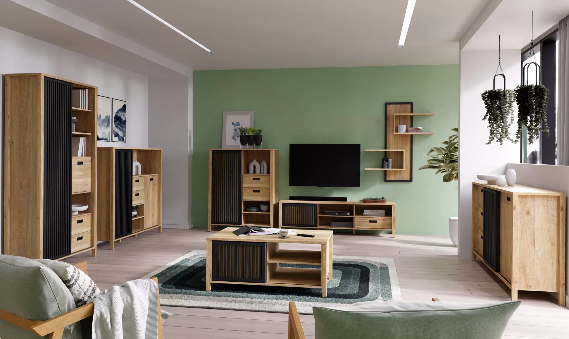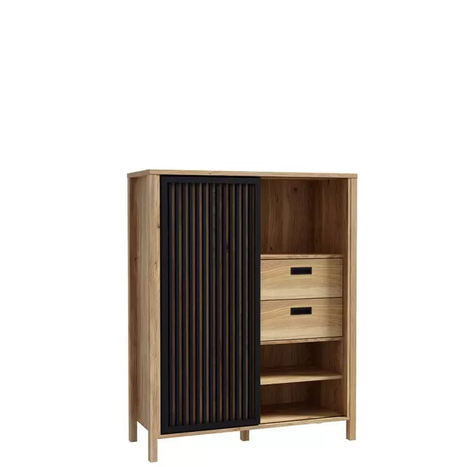 Szczególnym elementem są przesuwane drzwi z czarnych lamel, które ukrywają cztery dodatkowe przegródki. Ta funkcjonalna i designerska szafka nie tylko zwiększa możliwości przechowywania, ale również dodaje charakteru i stylu każdemu wnętrzu.