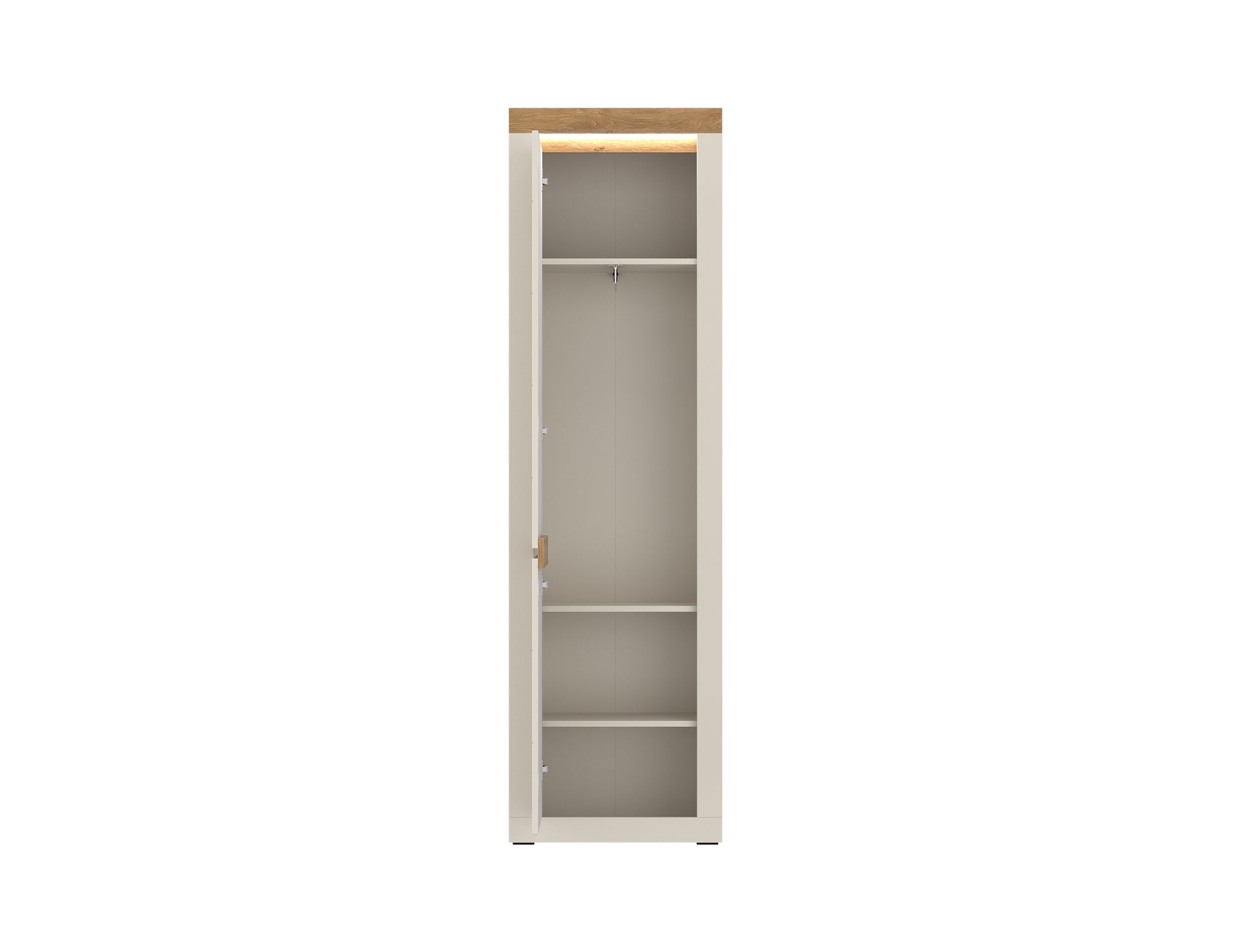 Ogromnym atutem szafy jest jej uniwersalne wnętrze – możliwość wyboru układu pozwala dostosować mebel do własnych potrzeb. Możesz zdecydować się na praktyczne półki, idealne do przechowywania obuwia, akcesoriów czy tekstyliów, lub wybrać opcję z miejscem na wieszanie odzieży wierzchniej. Dzięki temu szafa świetnie sprawdzi się zarówno jako garderoba, jak i dodatkowa przestrzeń organizacyjna.