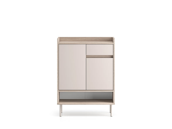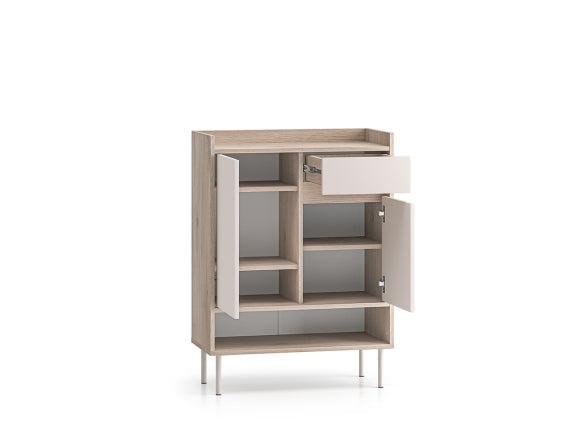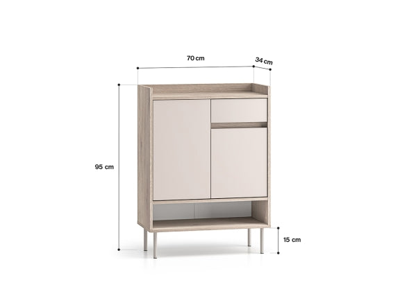 Przy szerokości 70 cm, wysokości 95 cm i głębokości 34 cm szafka dobrze sprawdzi się również w węższych korytarzach. Nie zajmuje dużo miejsca, a jednocześnie oferuje funkcjonalną przestrzeń do przechowywania. Nóżki unoszą korpus nad podłogą, co ułatwia sprzątanie i nadaje bryle wizualnej lekkości.