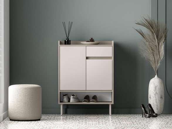 Szafka na buty Voco pomaga zorganizować przestrzeń w przedpokoju i zachować estetyczny wygląd wnętrza. Zamykane drzwi skutecznie ukrywają obuwie, a praktyczna szuflada pozwala oddzielić drobne akcesoria od pozostałych rzeczy. Zestawienie kolorystyczne: front w odcieniu Cashmere oraz korpus Dąb Cremona Terracotta nadają meblowi nowoczesny, a jednocześnie ciepły charakter, który dobrze komponuje się z różnymi aranżacjami.