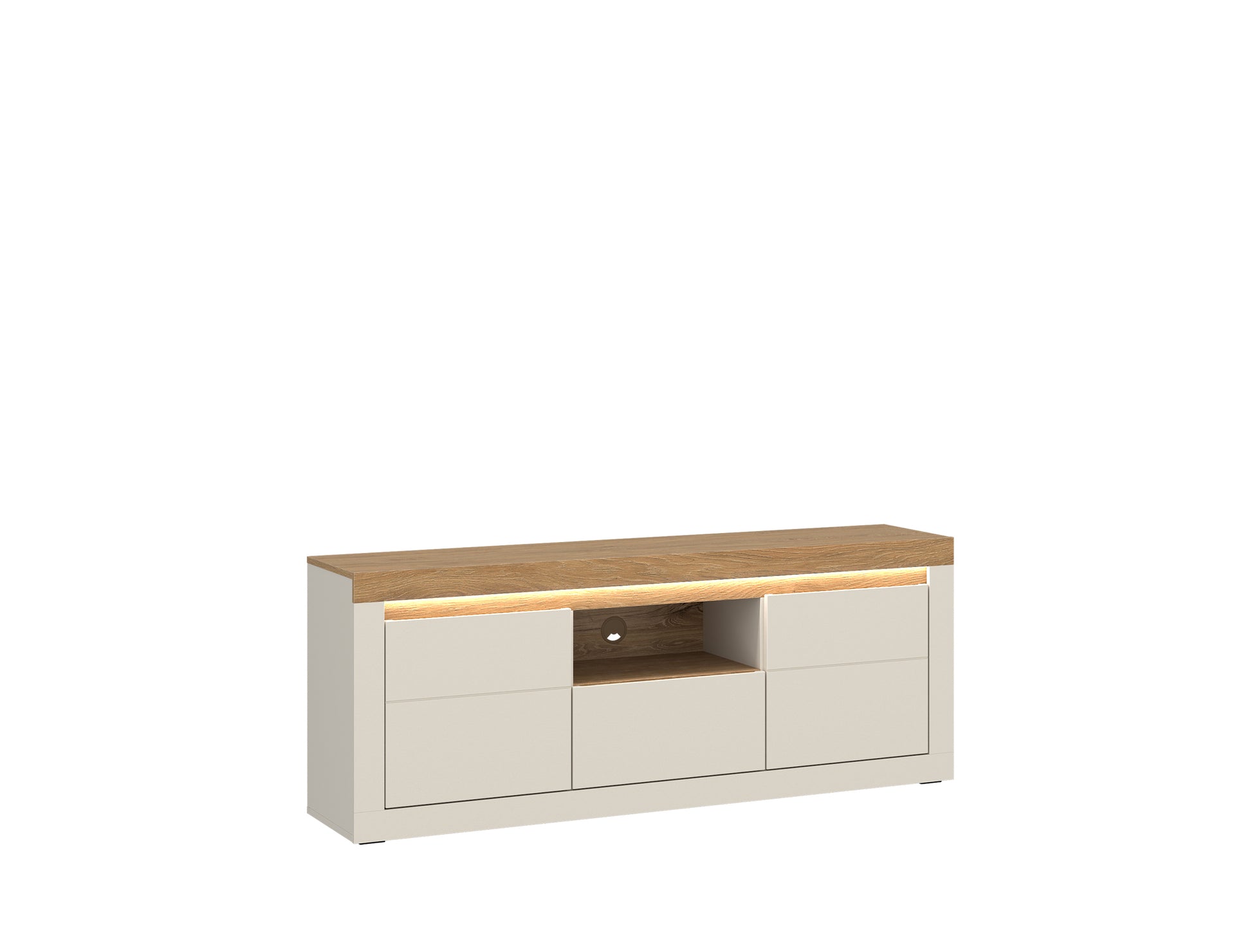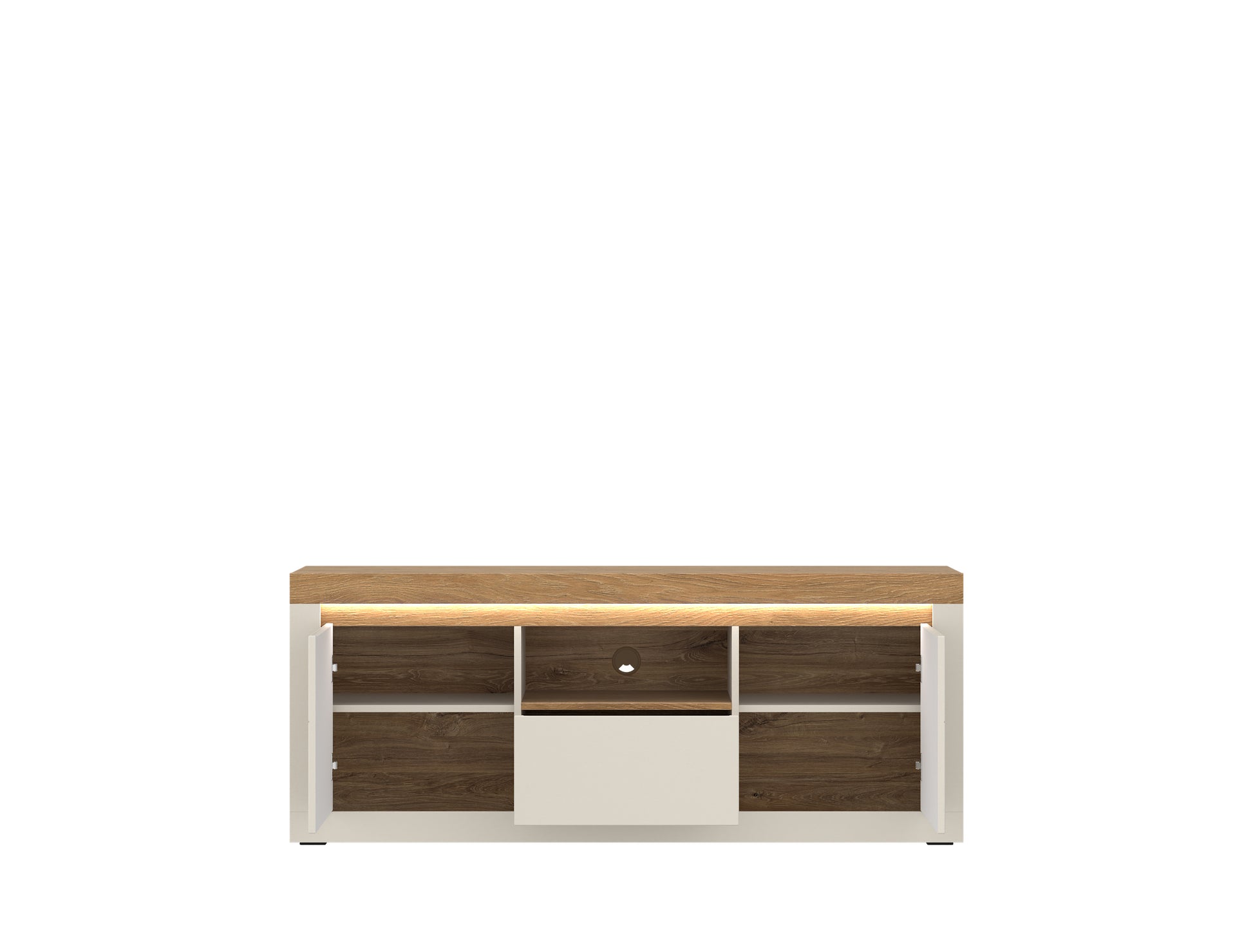 Zamknięte fronty pozwalają zachować porządek i estetykę przestrzeni, natomiast pojemna szuflada ułatwia organizację drobnych elementów. Szafka doskonale sprawdzi się jako baza pod telewizor, tworząc spójną i uporządkowaną strefę multimedialną.