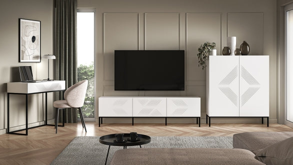 Korpus wykonano z płyty MDF, a elementy nośne z metalu, co gwarantuje trwałość konstrukcji przy umiarkowanej wadze 13 kg. Podparcie na nóżkach zapewnia stabilność mebla i ułatwia dostęp do przestrzeni pod szafką. Produkt dostarczany jest w stanie do samodzielnego montażu.