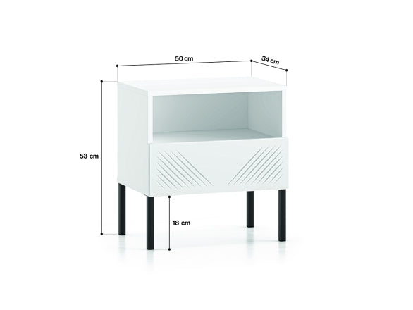 Szafka ma wymiary 50 × 53 × 34 cm (szer. × wys. × gł.), dzięki czemu łatwo ustawić ją nawet w mniejszych sypialniach. Przemyślane proporcje umożliwiają wygodne korzystanie z półki i szuflady, nie zabierając cennej przestrzeni przy łóżku.