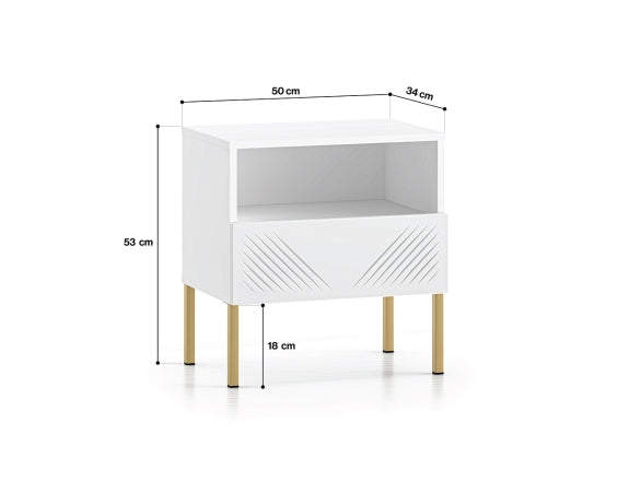 Szafka ma wymiary 50 × 53 × 34 cm (szer. × wys. × gł.), dzięki czemu łatwo ustawić ją nawet w mniejszych sypialniach. Przemyślane proporcje umożliwiają wygodne korzystanie z półki i szuflady, nie zabierając cennej przestrzeni przy łóżku.