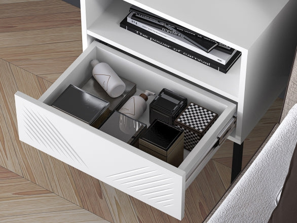 Szafka nocna Clearing łączy otwartą półkę i pojemną szufladę, oferując wygodne miejsce na przedmioty, które warto mieć zawsze pod ręką, oraz dyskretne schowki na drobne akcesoria. Pełny front z dekoracyjnym ryflowaniem nadaje meblowi uporządkowany, nowoczesny wygląd, a półokrągły kształt blatu ułatwia odkładanie rzeczy bez zajmowania nadmiernej przestrzeni.