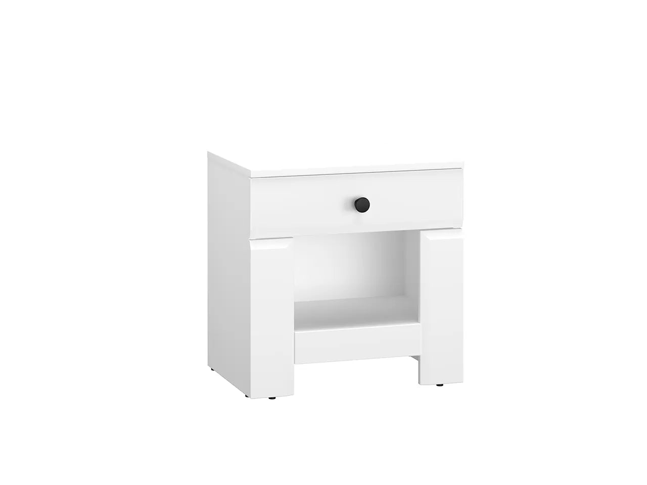 Stolik nocny Lahti ma białą laminowaną płytę meblową, która nadaje mu nowoczesny wygląd i trwałość. Front stolika wykonany jest z płyty MDF, co zapewnia gładką powierzchnię i dodatkową wytrzymałość.