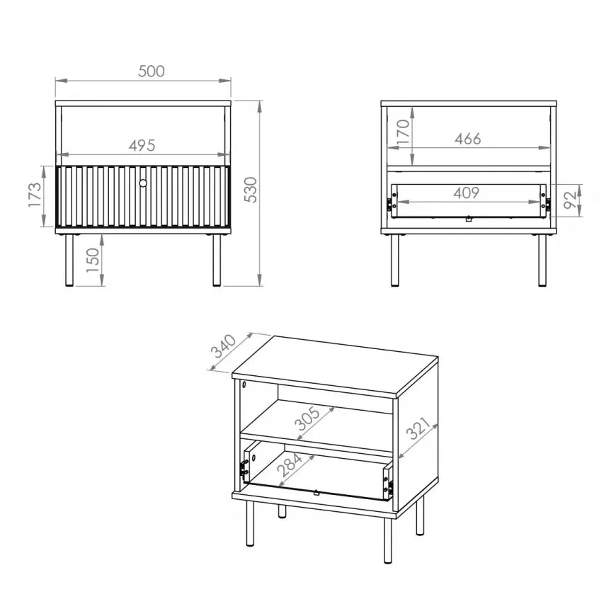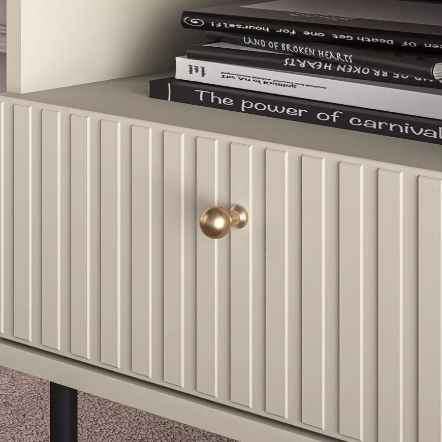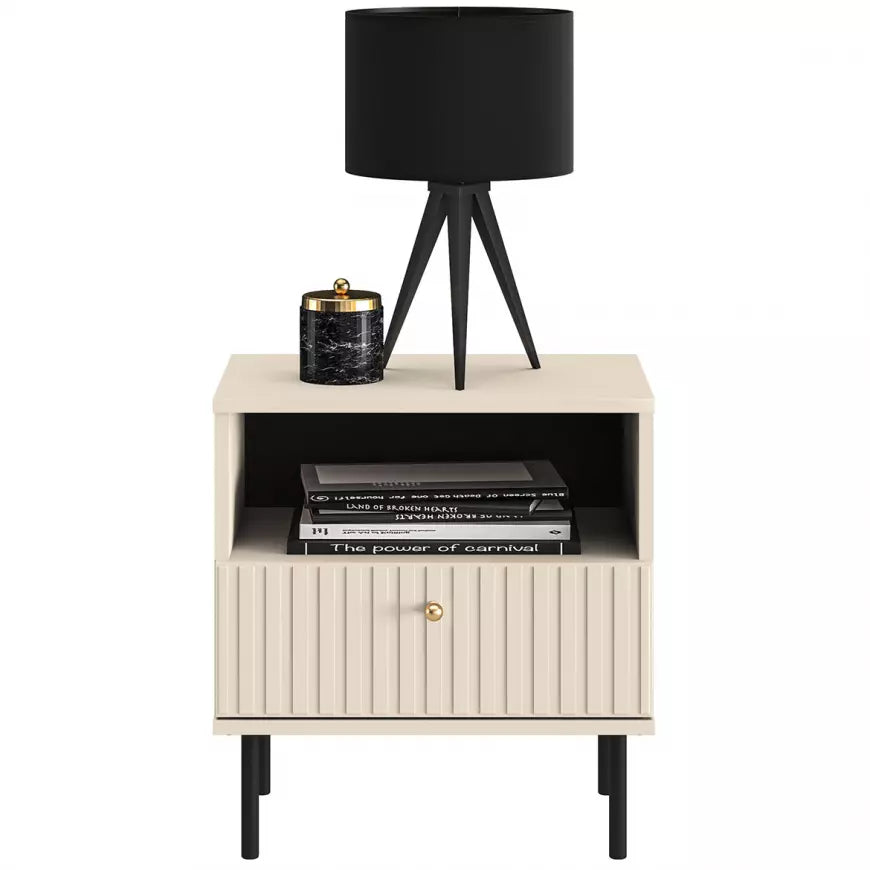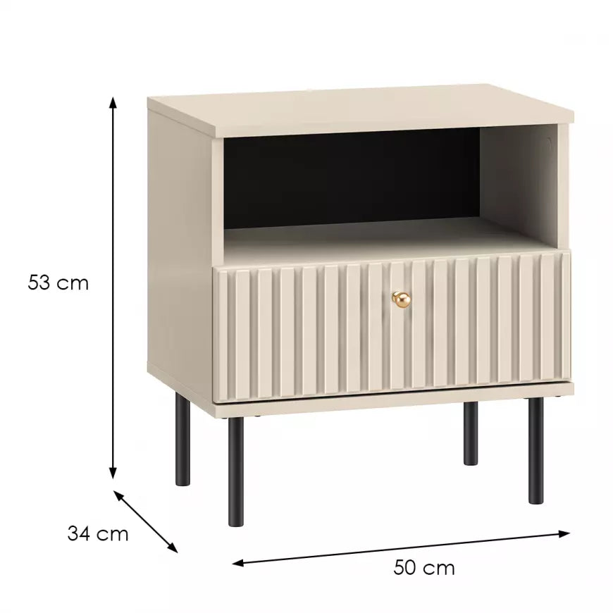 Front szafki nocnej Sophie wykonany jest z MDF ryflowanego, co nadaje meblowi unikatowego wyglądu i struktury. To wyrafinowany detal, który wzbogaca wygląd mebla i wnosi element elegancji.
