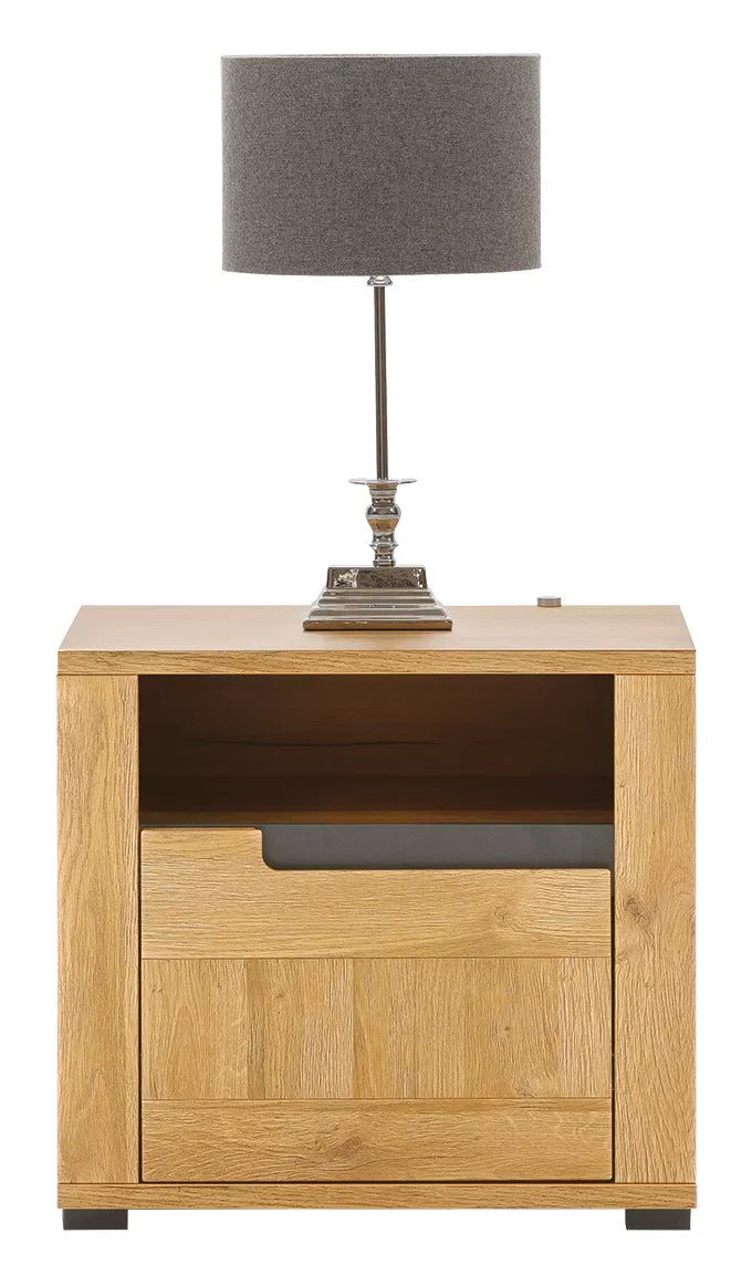 Szafka nocna York to praktyczny mebel, który doskonale komponuje się z sypialnianą aranżacją. Jest wyposażona w półkę oraz otwieraną szafkę, zapewniając miejsce do przechowywania różnych przedmiotów w zasięgu ręki.