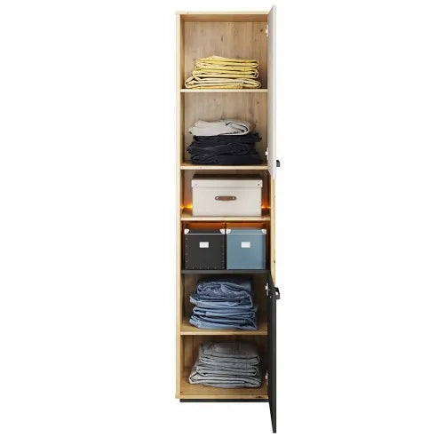 Szukasz pomysłowego miejsca na książki? A może potrzebujesz więcej miejsca w pokoju dziecka, jednocześnie chcąc wyeksponować ważne pamiątki Twojego dziecka? W takim wypadku idealnie sprawdzi się szafka Qubic, zaprojektowany przez Lenart Meble. Produkt ten, dzięki modnemu oświetleniu LED dodatkowo podkreśli książki, zdjęcia, pamiątki, a także ociepli wnętrze i nada mu nadzwyczajności. Zarówno za górnymi, jak i dolnymi, zamykanymi drzwiczkami znajdziesz półkę, będącą idealnym miejscem na ubrania dziecka, zabawki, a także przybory szkolne. Ciekawe wybarwienie – surowa stal, delikatna szarość oraz drewno sprawi, że wnętrze będzie wyglądało bardzo stylowo, jednocześnie wpasowując w gust dziewczynki, jak również młodego chłopca. Szafka Qubic do pokoju młodzieżowego posłuży Ci przez długie lata, ponieważ została zbudowany z trwałej płyty laminowanej wykończonej obrzeżem ABS.