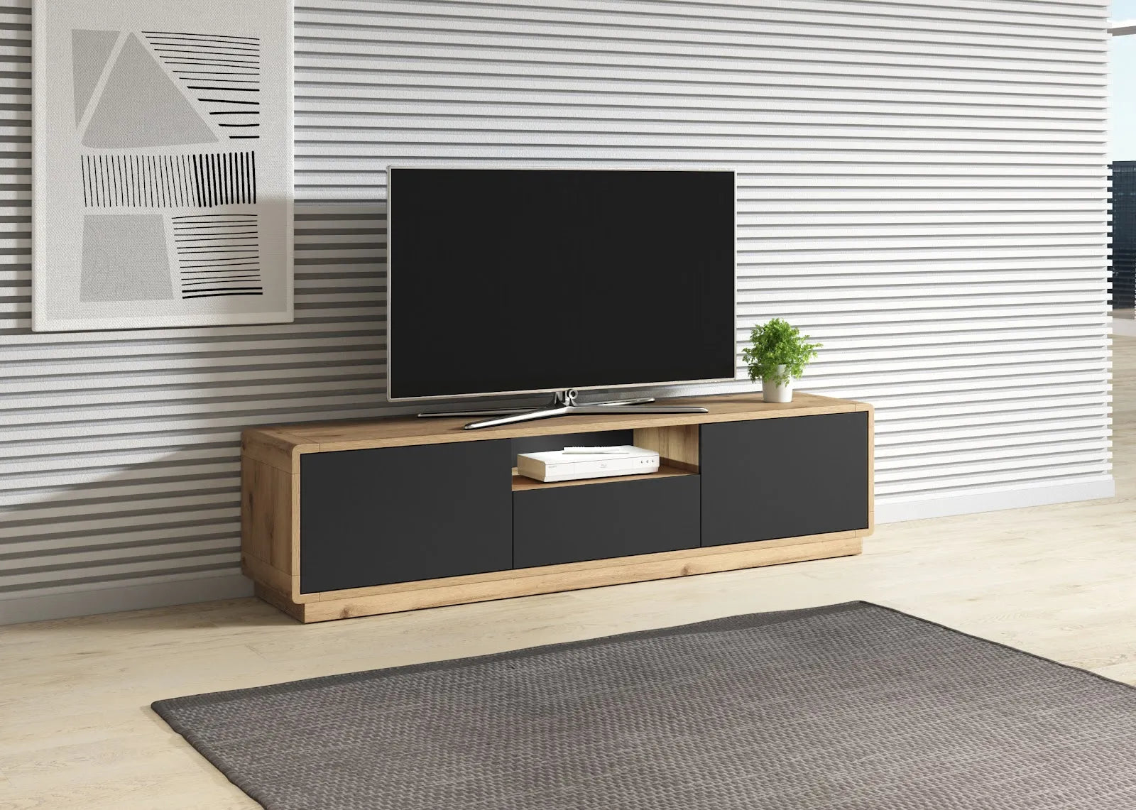Funkcjonalność mebla podkreślają liczne detale, takie jak cichy domyk, gwarantujący spokojne zamykanie drzwi, oraz innowacyjna technologia push to open, ułatwiająca otwieranie drzwi bez użycia uchwytów. Nasza szafka RTV to nie tylko estetyczne rozwiązanie, ale również wyjątkowo praktyczne miejsce do przechowywania sprzętu multimedialnego.