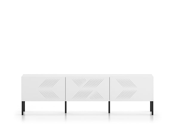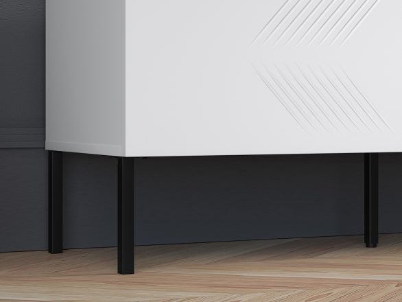 Szafka ma prostokątny blat, a front został podzielony na trzy równe sekcje z geometrycznym, liniowym wzorem, który nadaje meblowi wyraźny, uporządkowany charakter. Prosta forma i minimalistyczne linie pozwalają łatwo dopasować szafkę do nowoczesnych aranżacji wnętrz.