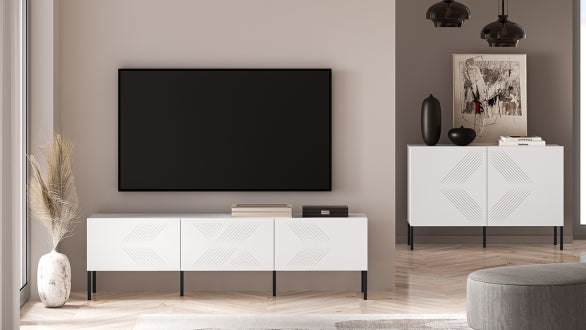 Podniesienie szafki na nóżkach optycznie odciąża bryłę mebla i ułatwia sprzątanie pod nią. Szafka sprawdzi się jako główny element strefy RTV, oferując wygodne miejsce na telewizor, sprzęt multimedialny i akcesoria, jednocześnie dbając o porządek i estetykę wnętrza.