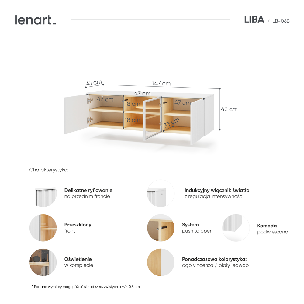 LIBA LB-06B - rtv wiszacy 2d1w z oświetleniem - biały jedwab/dąb vincenza