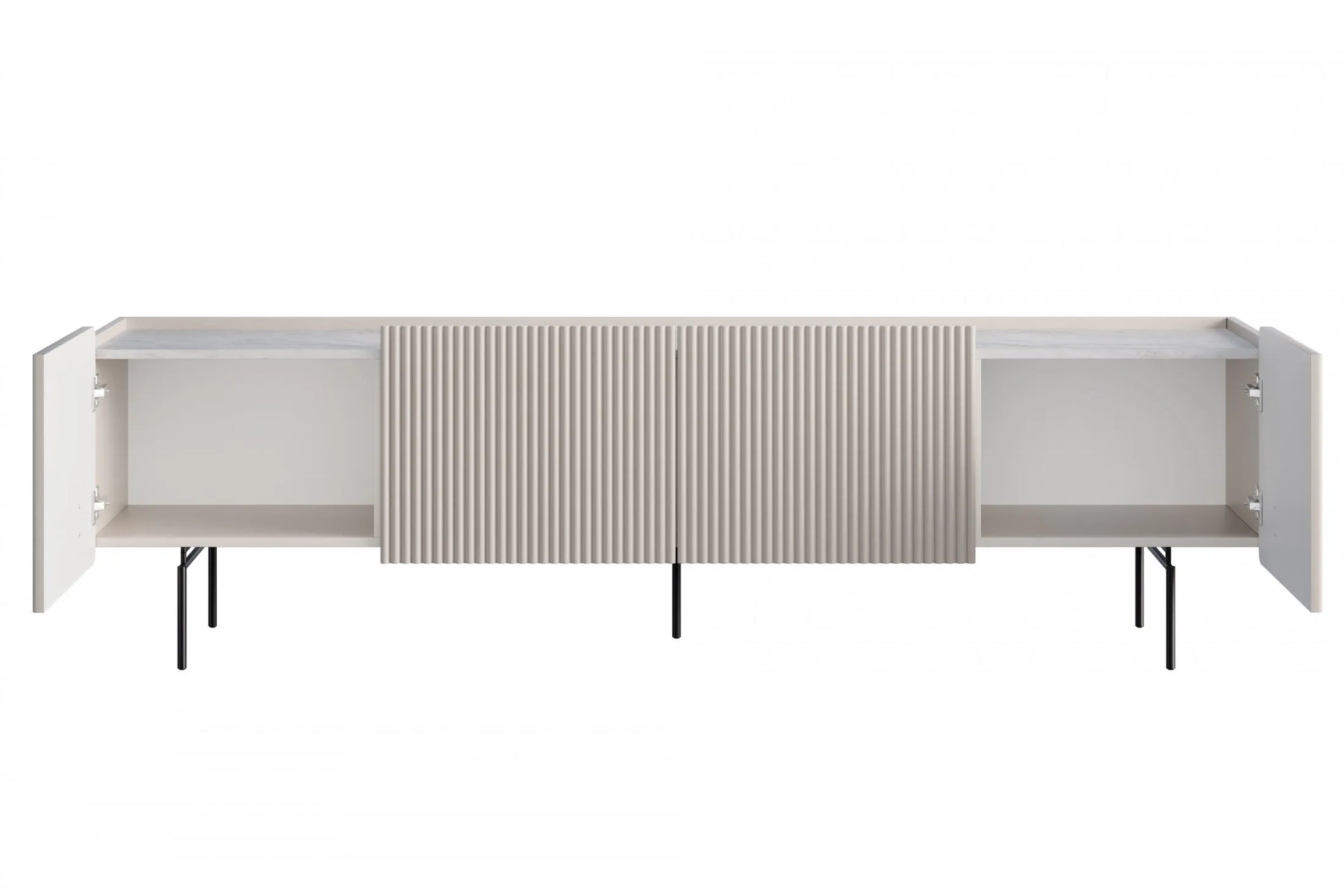 Szafka RTV Malmi o szerokości 200 cm to idealne rozwiązanie do stworzenia przytulnego miejsca do relaksu z ulubionym filmem lub serialem. Jej wyjątkowa kolorystyka, łącząca odcienie kaszmiru i crema bianca, nadaje meblowi eleganckiego i nowoczesnego charakteru, idealnie wpisując się w minimalistyczne wnętrza. Matowe wykończenie dodaje subtelności, a czarne nóżki podkreślają luksusowy design, stając się ozdobą każdego pomieszczenia.