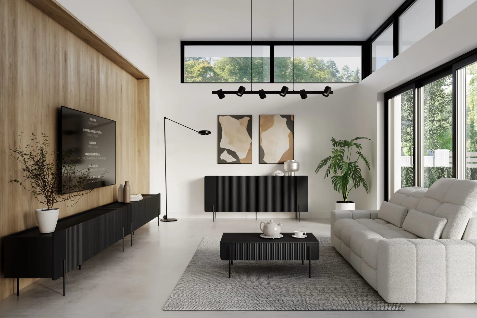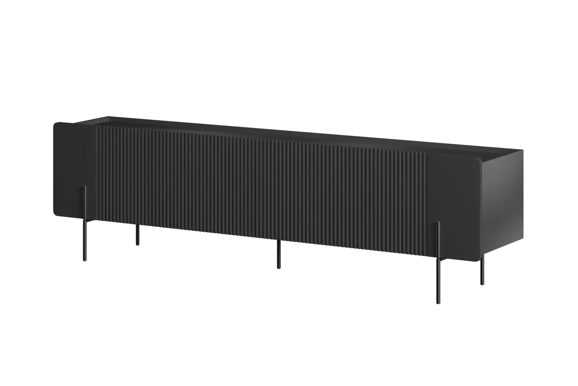 Szafka RTV Malmi o szerokości 200 cm to idealne rozwiązanie do stworzenia przytulnego miejsca do relaksu z ulubionym filmem lub serialem. Matowe wykończenie dodaje subtelności, a czarne nóżki podkreślają luksusowy design, stając się ozdobą każdego pomieszczenia.