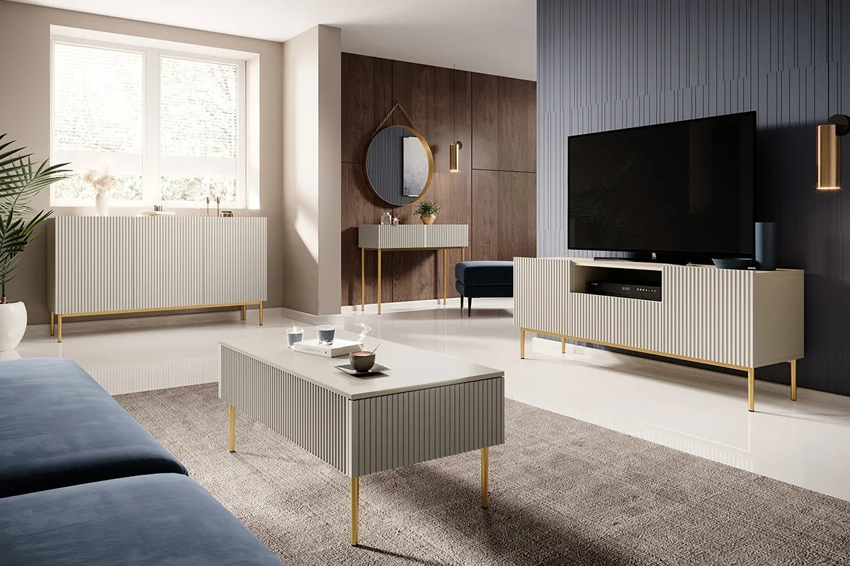 Jej front został wykonany z frezowanego MDF, co nadaje mu niepowtarzalny, ręcznie wykończony charakter. To sprawia, że szafka prezentuje się nie tylko solidnie, ale także dodaje wnętrzu nuty luksusu. Złote nóżki, na których stoi szafka, dodają całości wyjątkowego uroku. Ten subtelny akcent sprawia, że mebel nabiera delikatnego blasku i pięknie komponuje się z innymi elementami wystroju wnętrza.