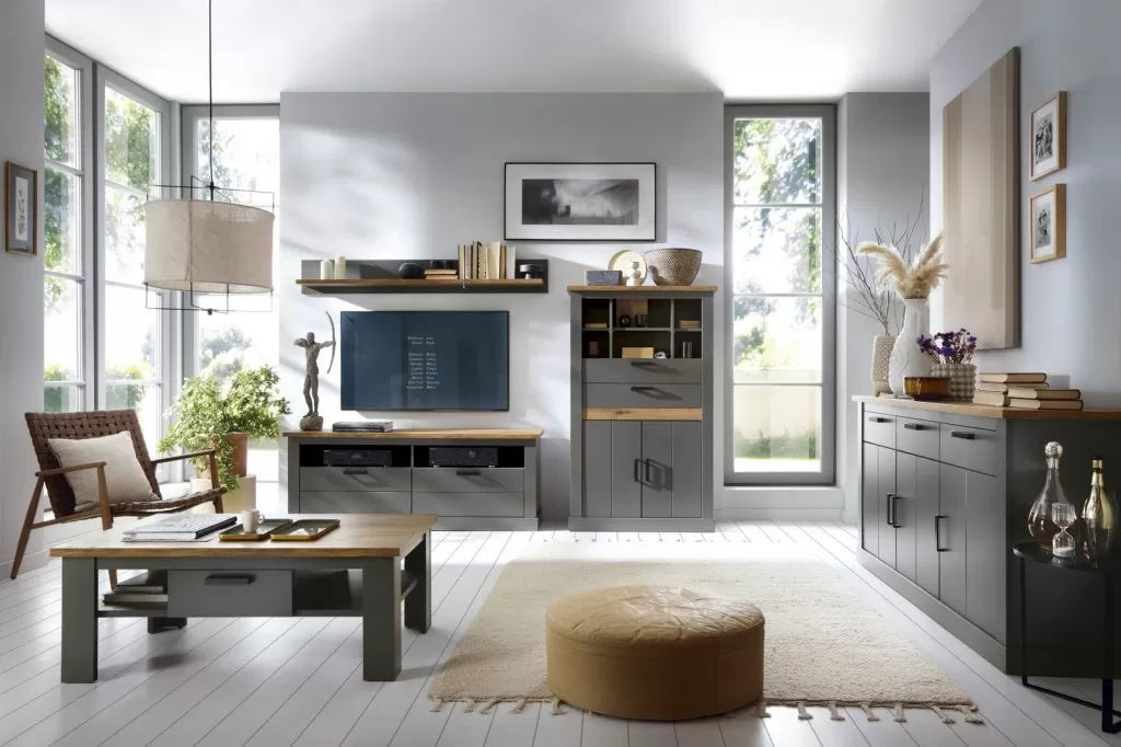 W kolorze antracytowym, szafka RTV Perazzo emanuje elegancją i nowoczesnością. Głęboka barwa antracytu nadaje jej meblewski charakter, który doskonale wpisuje się w nowoczesne i minimalistyczne aranżacje. Dodatki w odcieniu dębu stanowią harmonijny kontrast, łagodząc surowość antracytu i wprowadzając przyjemne akcenty naturalnego drewna.