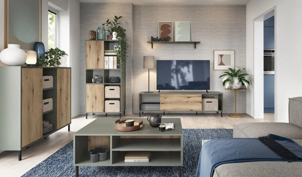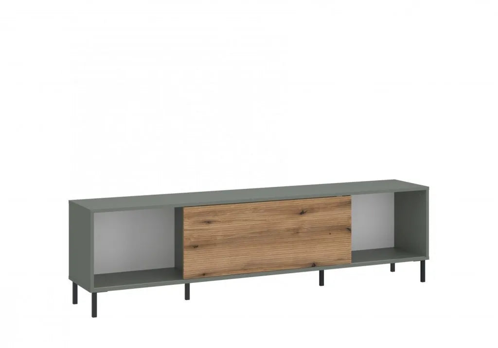 Jej minimalistyczna forma opiera się na prostocie kształtu, uzupełnionej o przesuwny front bezuchwytowy z ryflowanym wykończeniem, który kryje część półek. Front w odcieniu naturalnego drewna (Dąb Coast Evoke) z wyraźnie wyczuwalną strukturą drewna tworzy interesujący kontrast z gładką, ciemnozieloną powierzchnią korpusu i półek. Przestronny układ półek pozwala na wyeksponowanie urządzeń multimedialnych, jednocześnie pomagając zachować porządek i ład w pomieszczeniu.