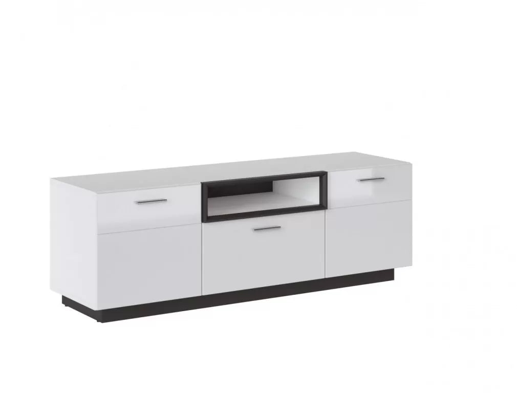 Front szafki RTV wykonany jest z płyty MDF, co zapewnia gładką i elegancką powierzchnię. Metalowe uchwyty dodają meblowi solidności i harmonijnie współgrają z jego designem. Zawiasy szafki są cichego domyku, co oznacza, że drzwi zamykają się płynnie i bezszelestnie. Prowadnice szuflady umożliwiają jej wysunięcie w 3/4, co ułatwia dostęp do przechowywanych przedmiotów.