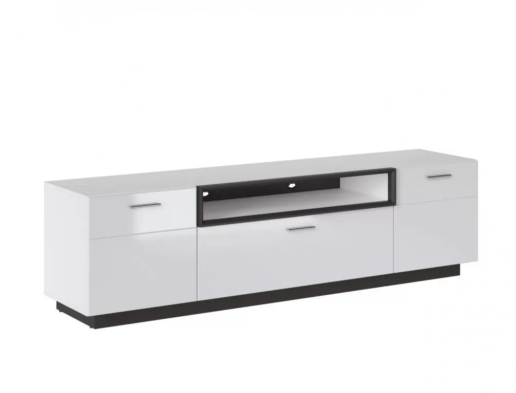 Front szafki RTV wykonany jest z płyty MDF, co zapewnia gładką i elegancką powierzchnię. Metalowe uchwyty dodają meblowi solidności i harmonijnie współgrają z jego designem. Zawiasy szafki są cichego domyku, co oznacza, że drzwi zamykają się płynnie i bezszelestnie.