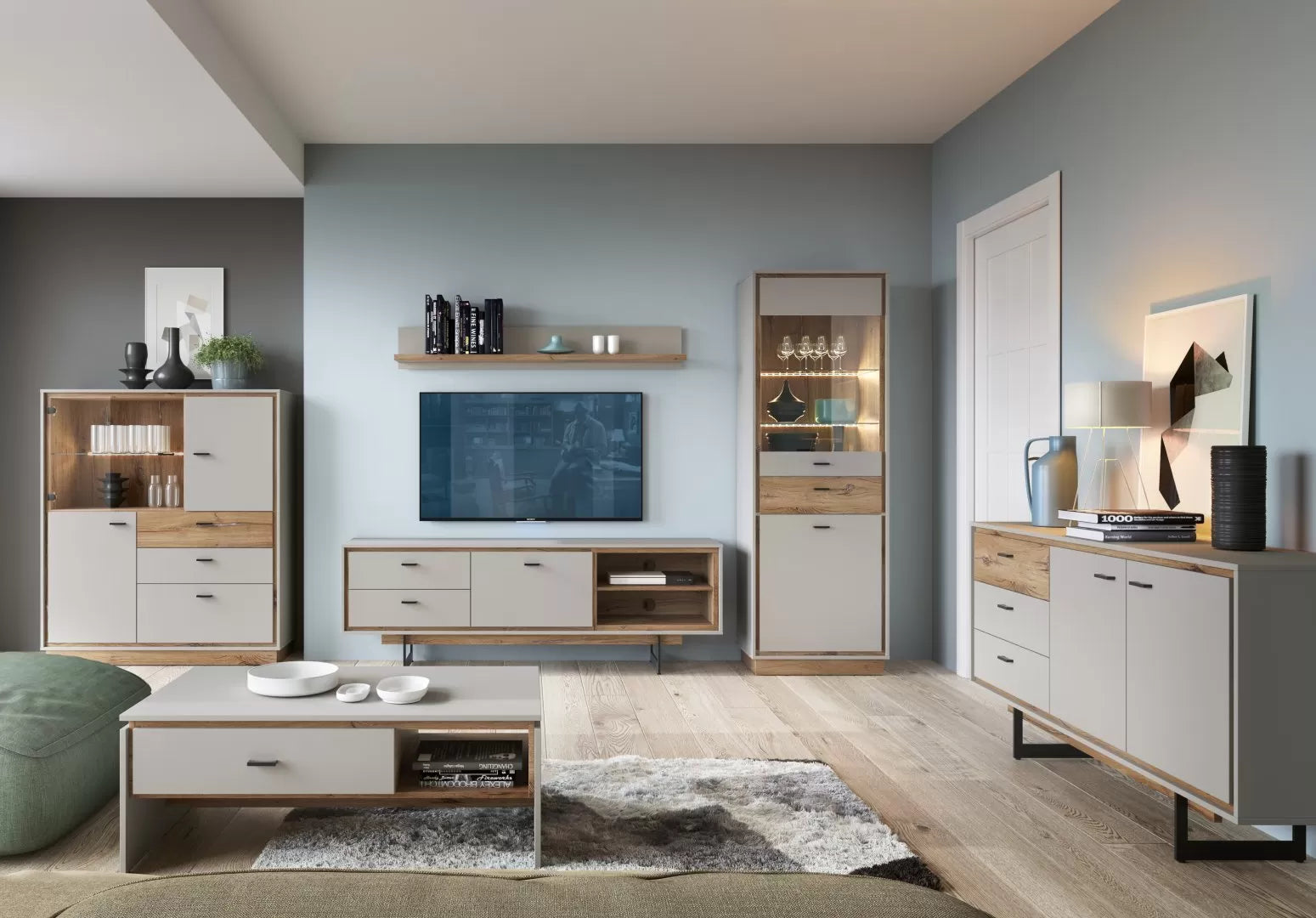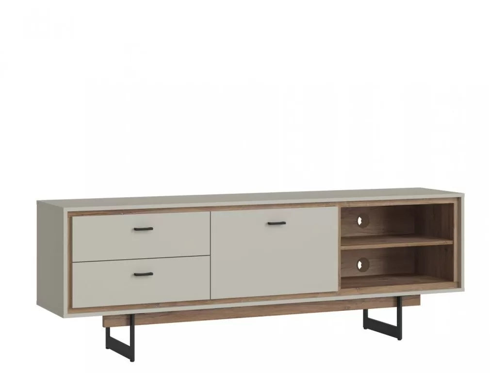 Szafka RTV Rivero to funkcjonalne i stylowe rozwiązanie do przechowywania sprzętu multimedialnego i dekoracji w salonie. Posiada dwie szuflady, które umożliwiają organizację mniejszych przedmiotów, takich jak piloty, kable czy inne akcesoria. Dodatkowo, szafka ma zarówno zamknięte półki, idealne do przechowywania elementów, których nie chcemy mieć na widoku, jak i otwarte półki, na których można wyeksponować dekoracje czy książki.