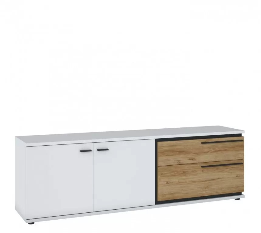 Szafka RTV Salinas to stylowe i funkcjonalne rozwiązanie do przechowywania telewizora, sprzętu audio-wideo i innych mediów. Wyposażona w dwie szuflady i zamknięte półki, pozwala na przechowywanie różnych akcesoriów i urządzeń w porządku i bezpieczeństwie.