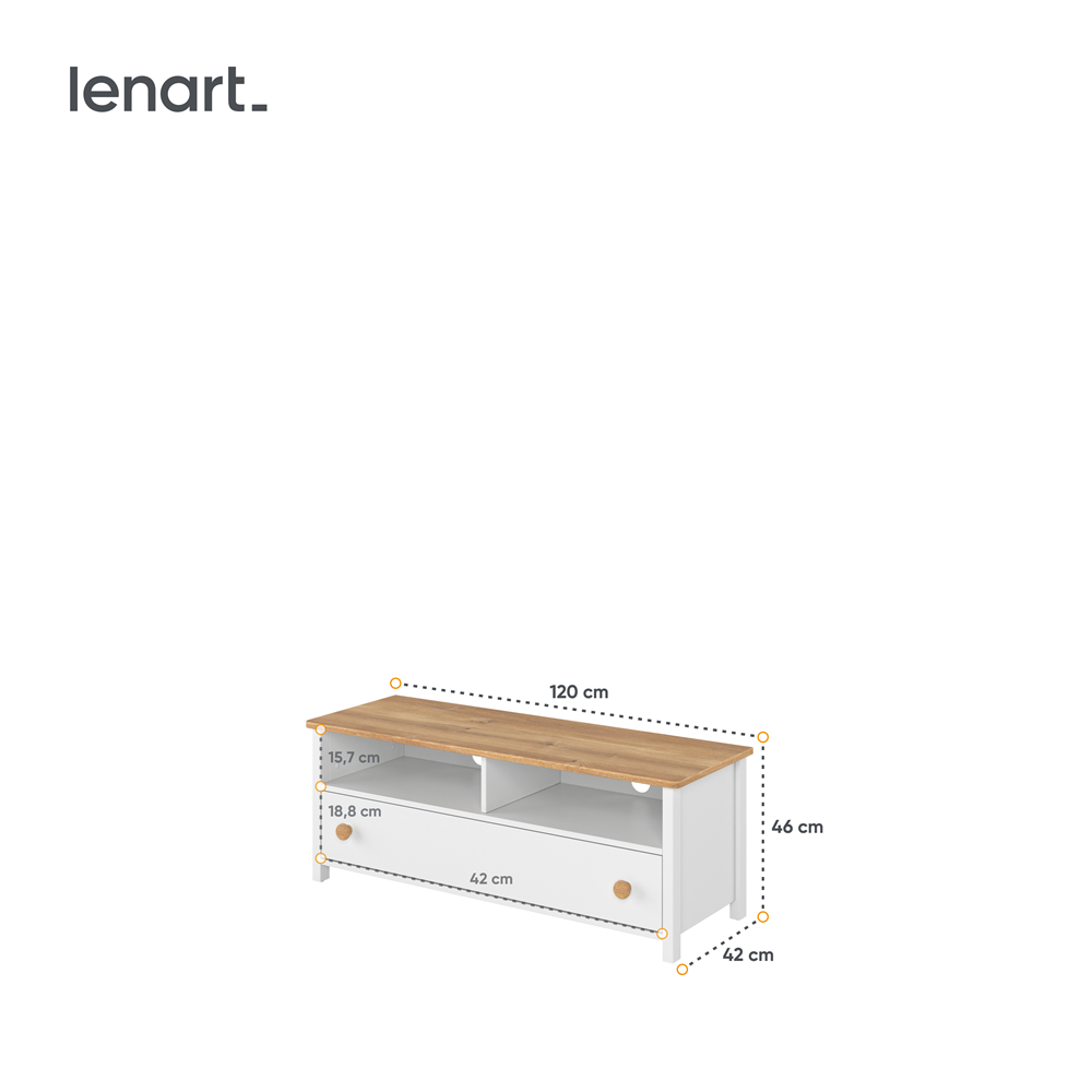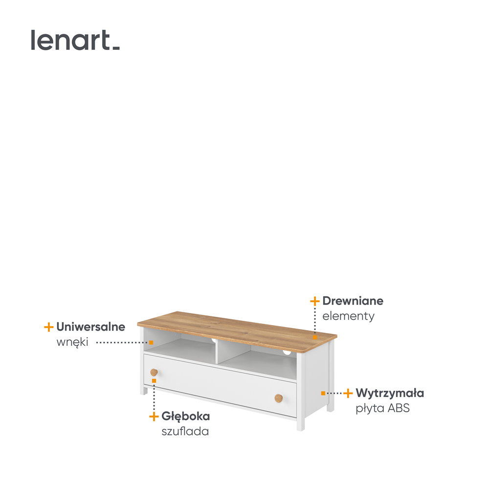 Szafka RTV o funkcjonalnym układzie, dwie wszechstronne wnęki na elektroniczne urządzenia oraz głęboka szuflada.