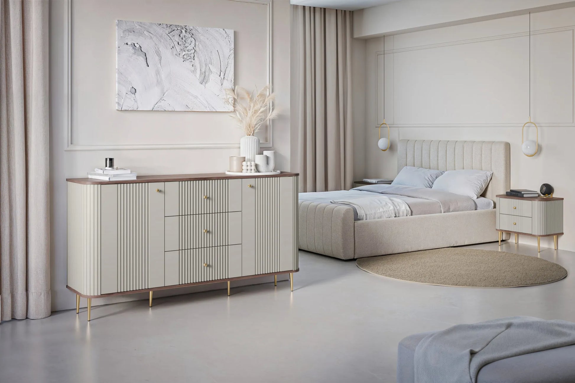 Subtelny kaszmir w połączeniu ze złotymi akcentami tworzy spójną i luksusową kompozycję, która idealnie wpasuje się zarówno w nowoczesne, jak i glamour czy minimalistyczne aranżacje sypialni. Ryflowany front nadaje szafkom oryginalnego charakteru i stanowi designerski akcent, który przyciąga wzrok.