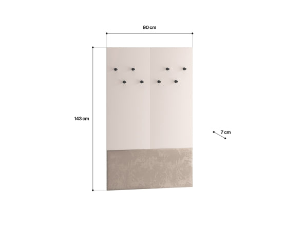 Na froncie rozmieszczono kilka praktycznych wieszaków, które umożliwiają odwieszenie jednocześnie kilku kurtek, toreb czy plecaków. Szerokość 90 cm zapewnia wygodną przestrzeń do użytkowania, a wysokość 143 cm gwarantuje, że okrycia wiszą swobodnie, bez zagnieceń.